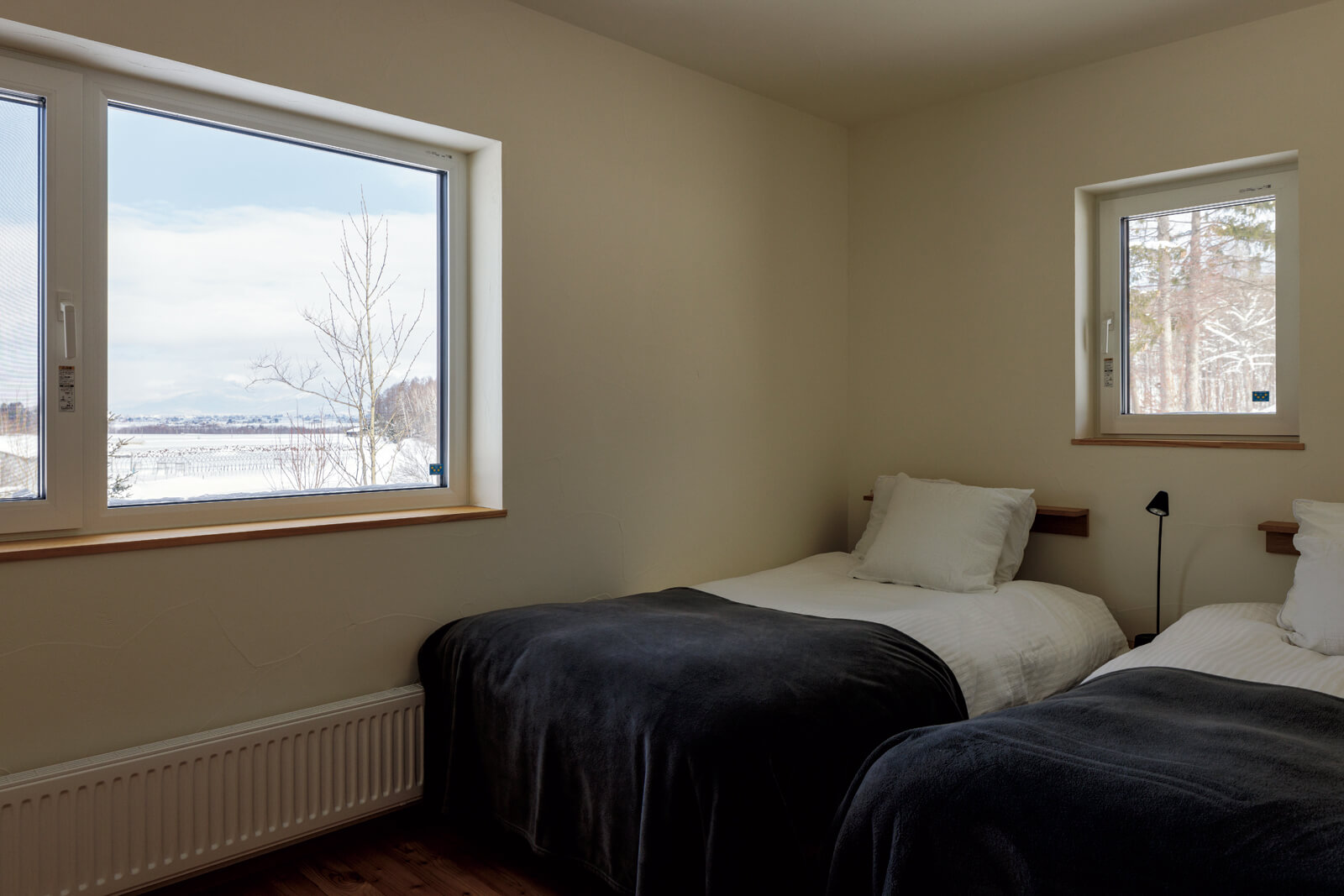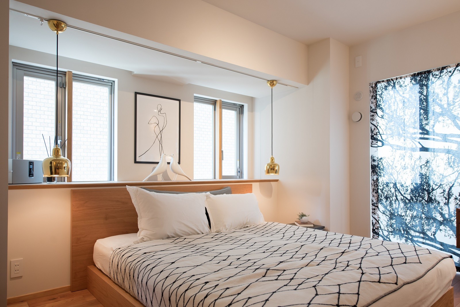 ベッドを挟んでシンメトリーに配置された小窓 - 厚木市のオーダーカーテン専門店「+PLAN プラスプラン 」。