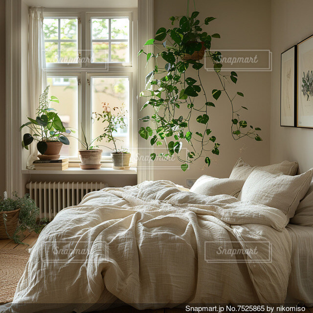 窓の隣に大きなベッドがあるホテルの部屋の写真・画像素材-Snapmart スナップマート。