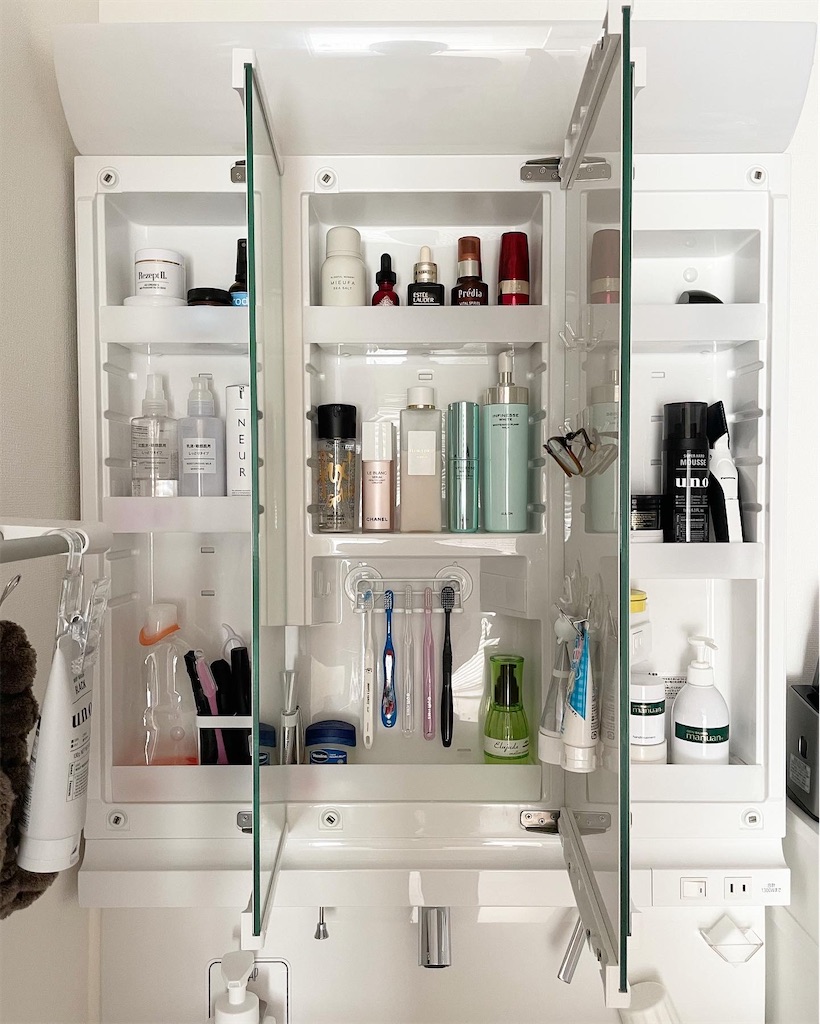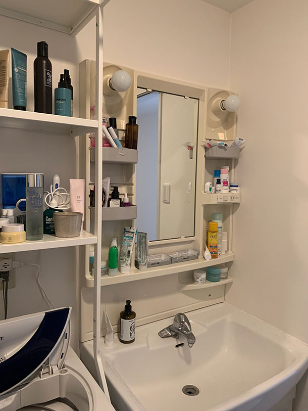 洗面台の鏡裏収納がドレッサーに大変身!使いにくい収納場所も無印良品の便利グッズでスッキリ収納が叶う。