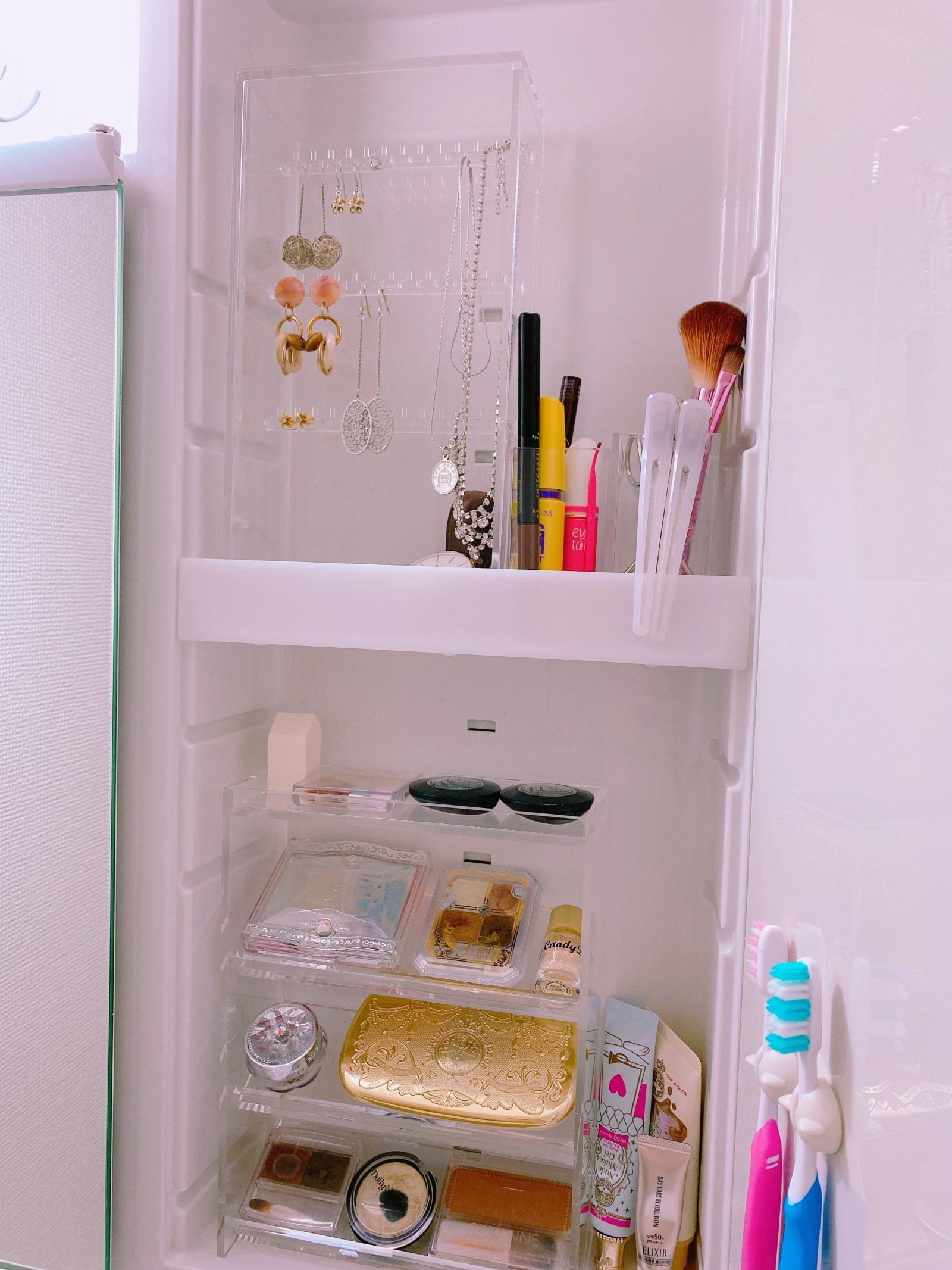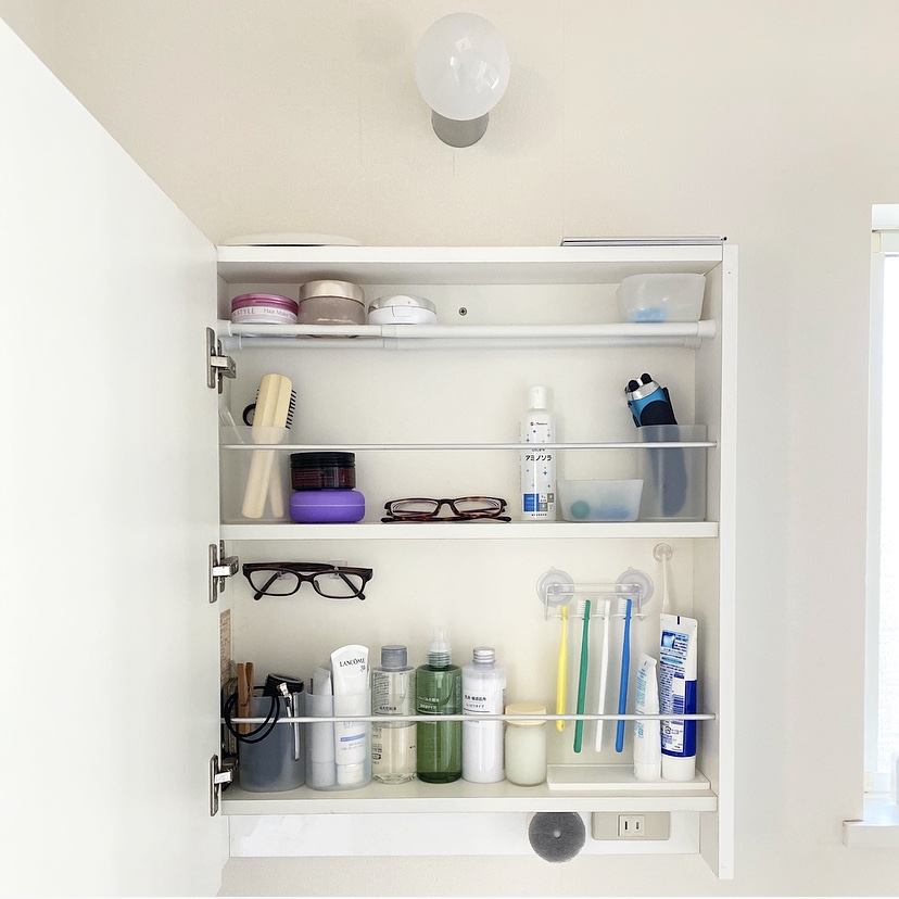 スッキリな洗面台へ*100円グッズも使いながら鏡裏収納をカスタマイズ*。