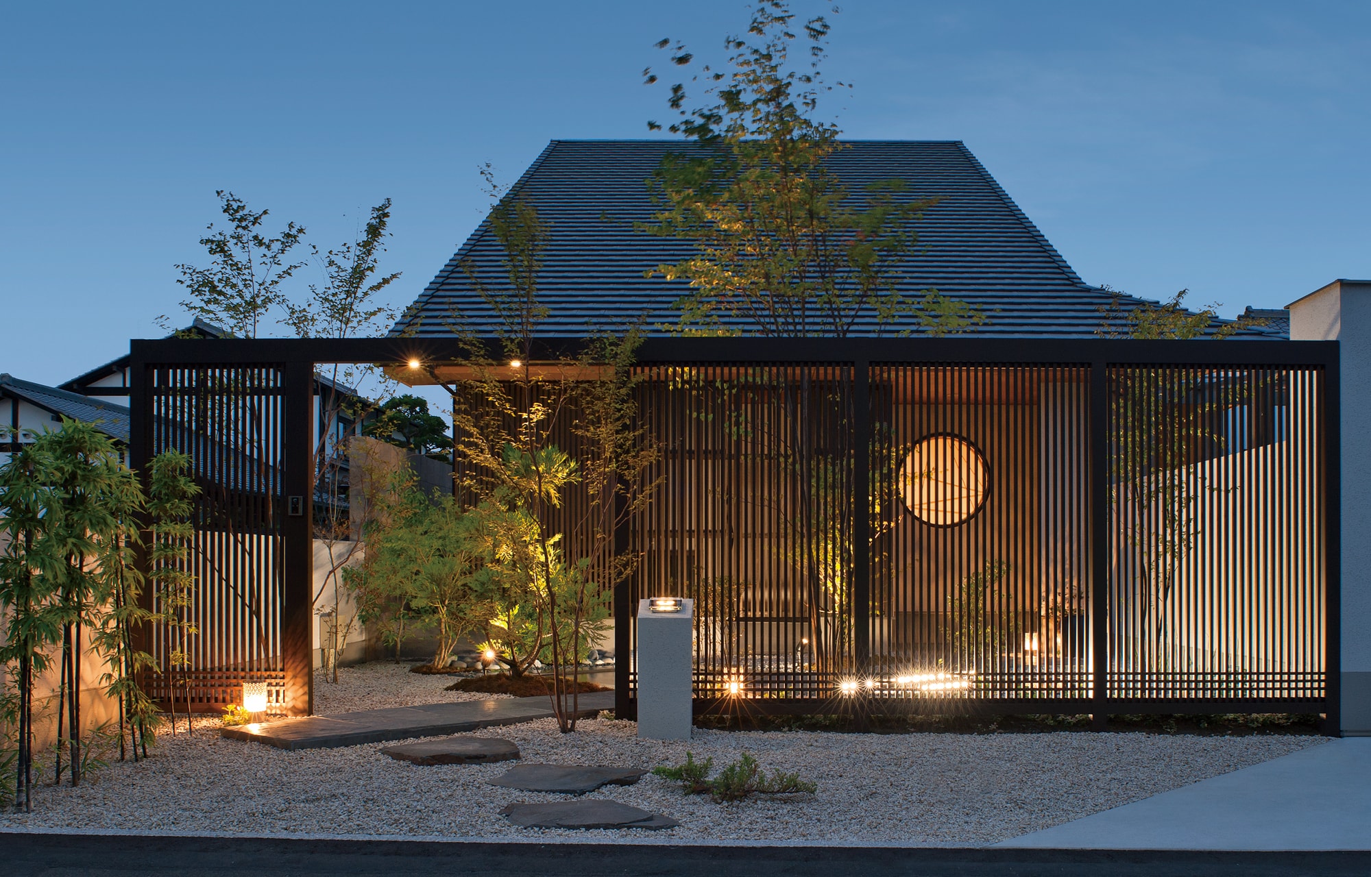 伝統的な和風建築にモダンなデザインを取り入れた、丸窓が特徴的なこの邸宅の外観 -事例写真「インナーガレージのある2階建4層の家」注文住宅のハウスネットギャラリ。