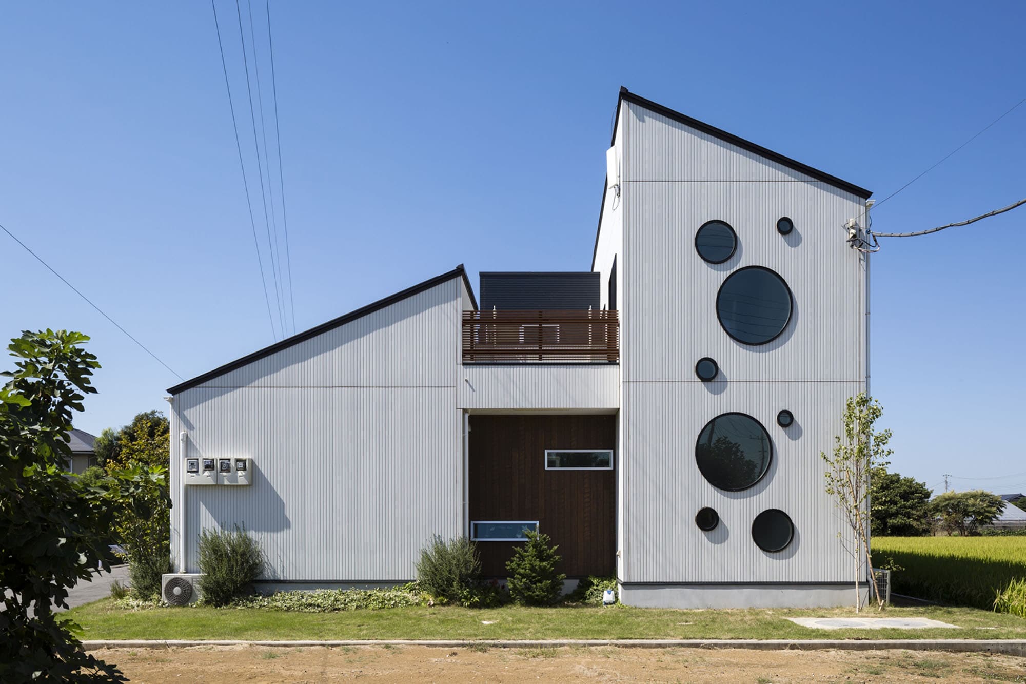 丸窓のある和モダンな外観 和モダンリゾートな家重量木骨の家。