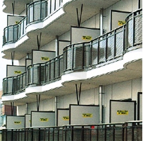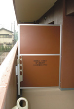 非常時にはボードを破って避難経路を確保できる バルコニー隔板 のご紹介!神栄ホームクリエイト物干金物、タラップ、室名札、郵便受箱、ドアハンドル等の建築金物メーカ。