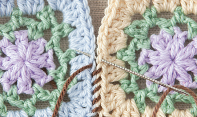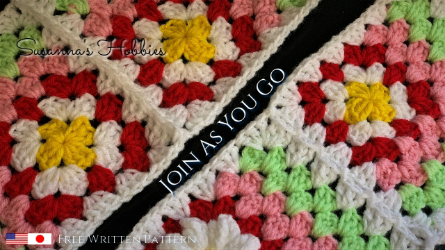 簡単かぎ針編み:縁取り映える「細編みつなぎ」グラニースクエアモチーフのつなぎ方、縁編み ボーダー の編み方。