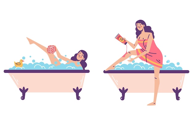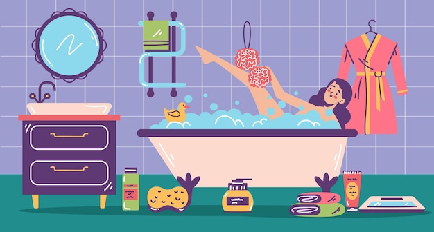 お風呂の女性リラックスバスルームコンセプトデザイングラフィックイラストPremiumベクトル素材。
