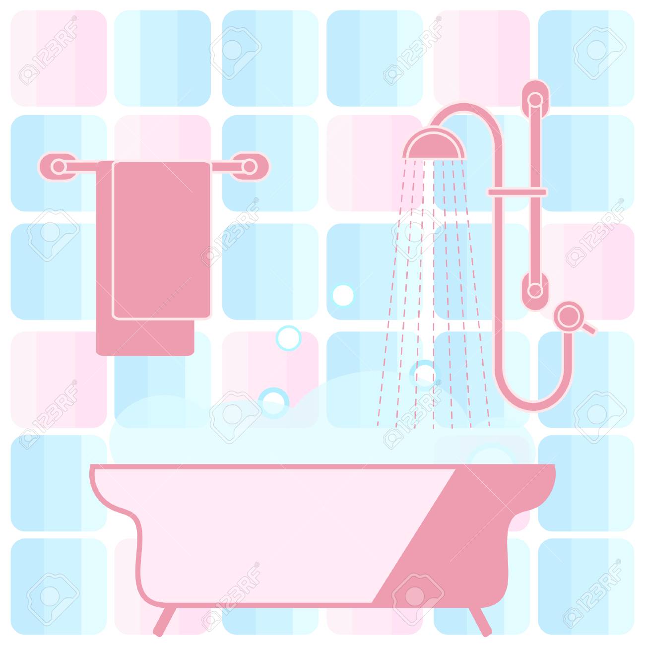 バスルームのインテリア デザインのかわいいベクトル イラスト: シャワー、お風呂、石鹸の泡、タオル ホルダーに掛かっています。ポスターまたは印刷用 デザイン。のイラスト素材・ベクター Image 84968551。