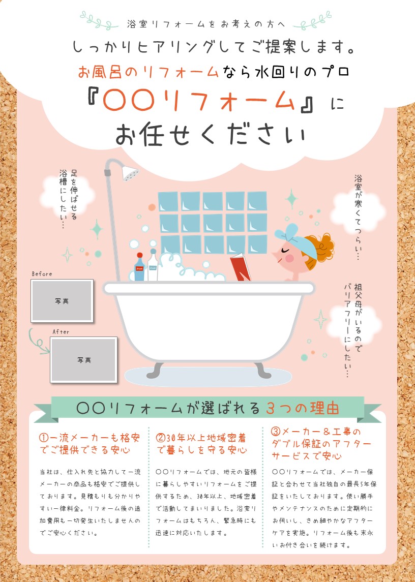 お風呂リフォームチラシデザインテンプレート イラスト・赤色 No.302チラシテンプレートセンタ。