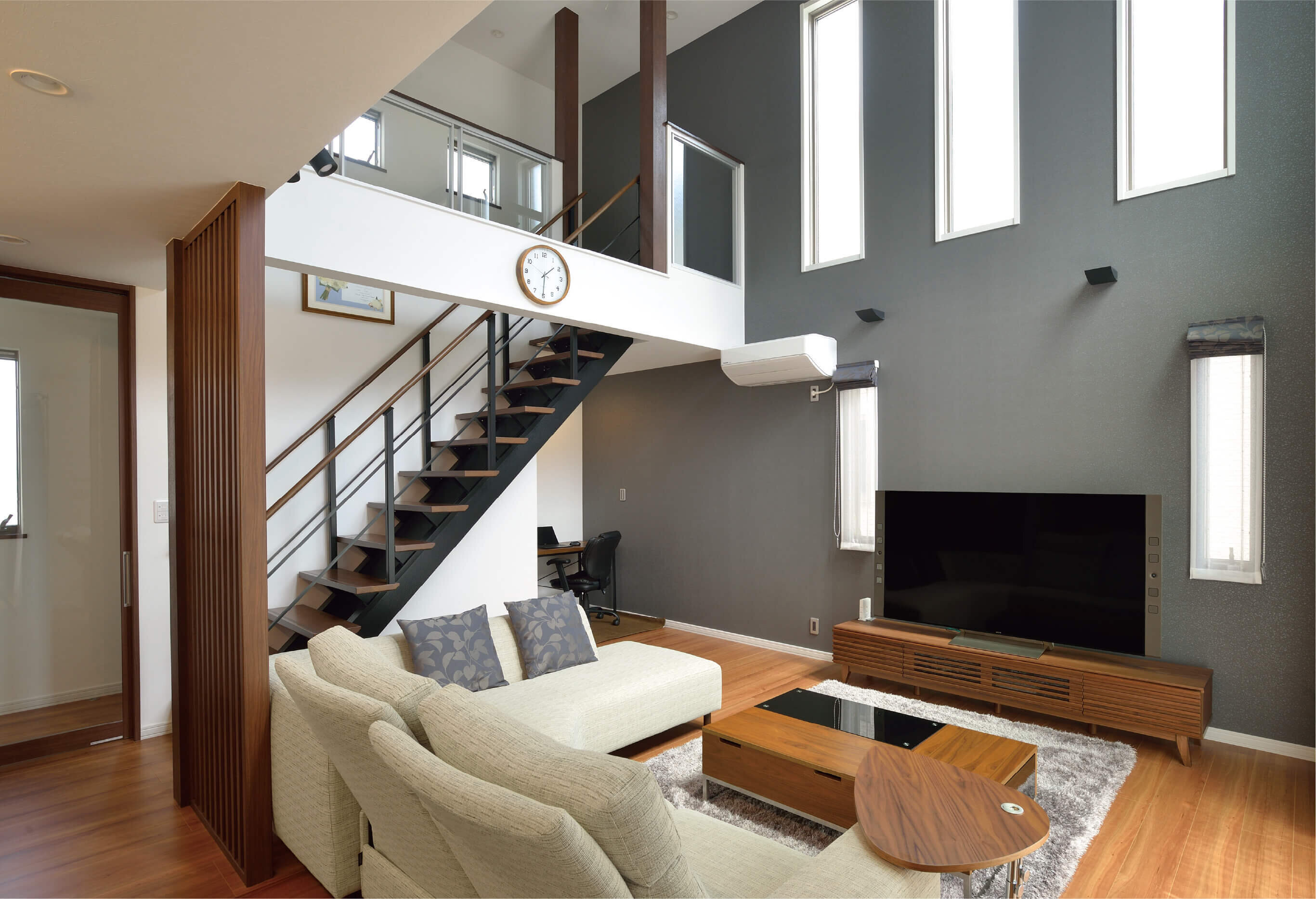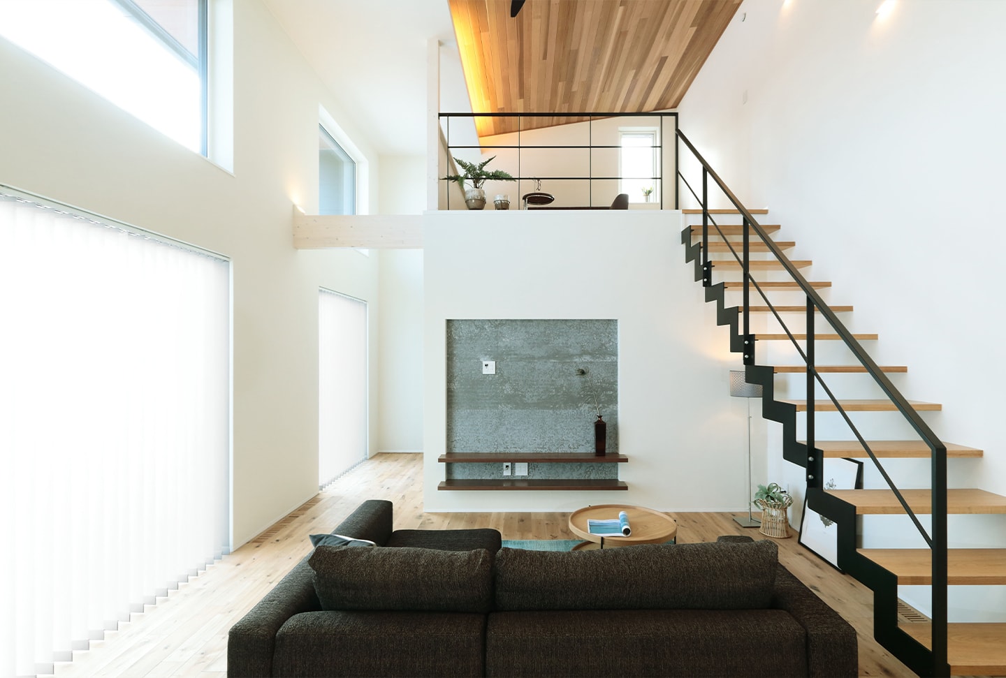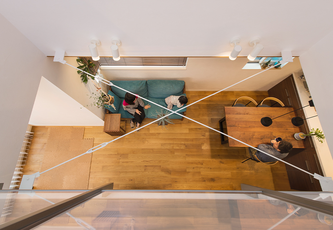 狭いリビングを吹き抜けにすることで空間を広く見せます。