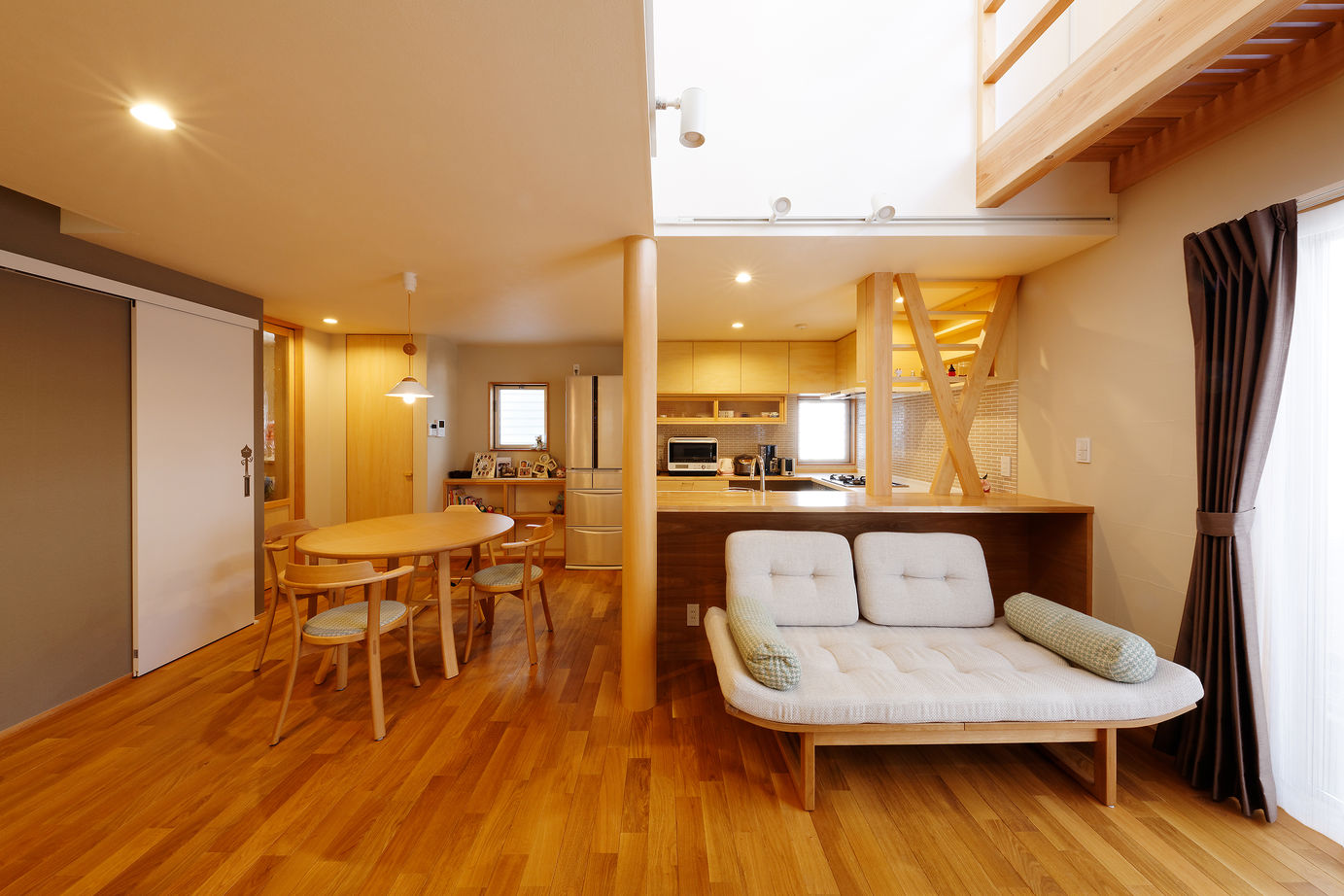 狭さを感じない25坪の狭小住宅木造住宅×吹抜け×おしゃれな家 吹抜けで開放的な25坪の狭小住宅 大阪 重量木骨の家。