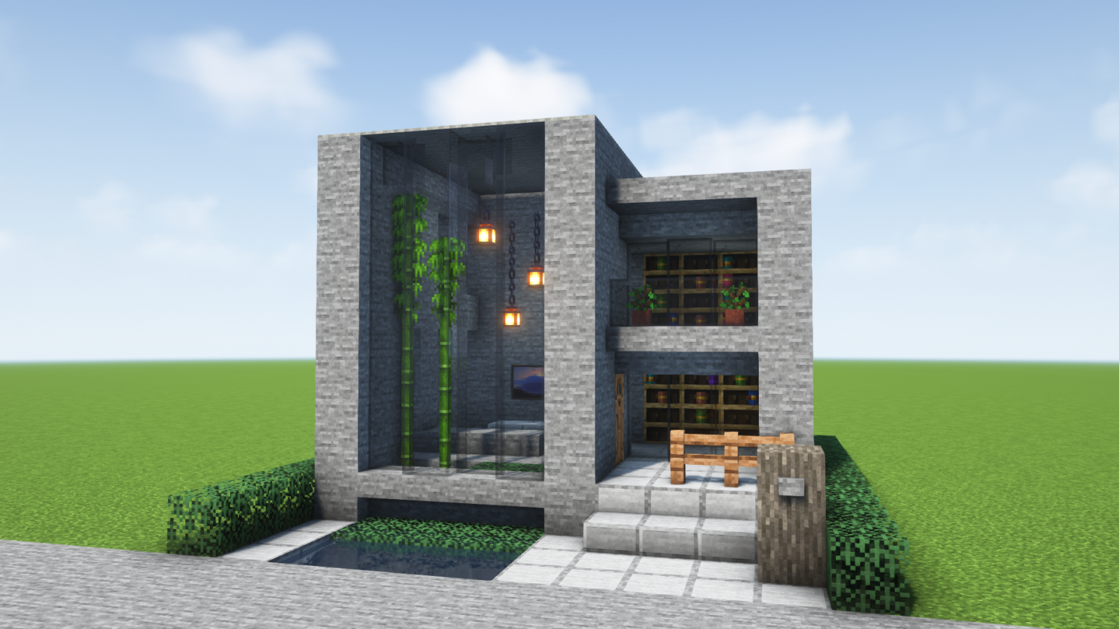 マイクラ建築:石のみで作るおしゃれでモダンな家。大きな吹き抜けフロア。簡単10×10。No.83SOUのマイクラログ。