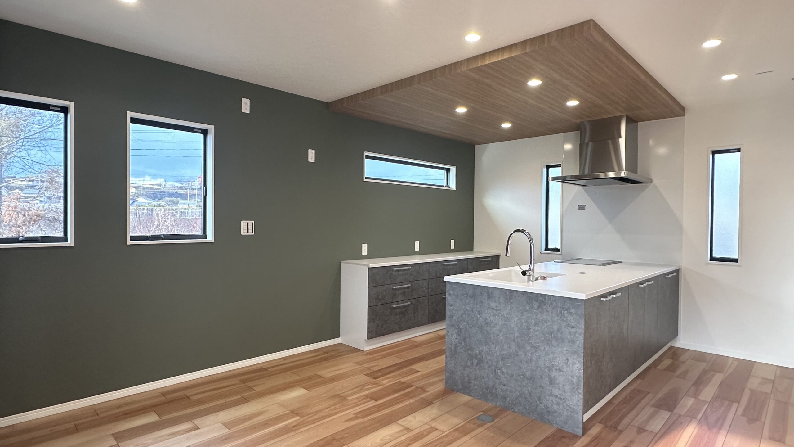 木目天井のキッチンスペース リビング 勾配天井 TOTOキッチン 木目クロスkitchen モダンデザイン 品番 木の家 福岡 施工事例 マグネットボード 造作ニッチ 木目クロス。