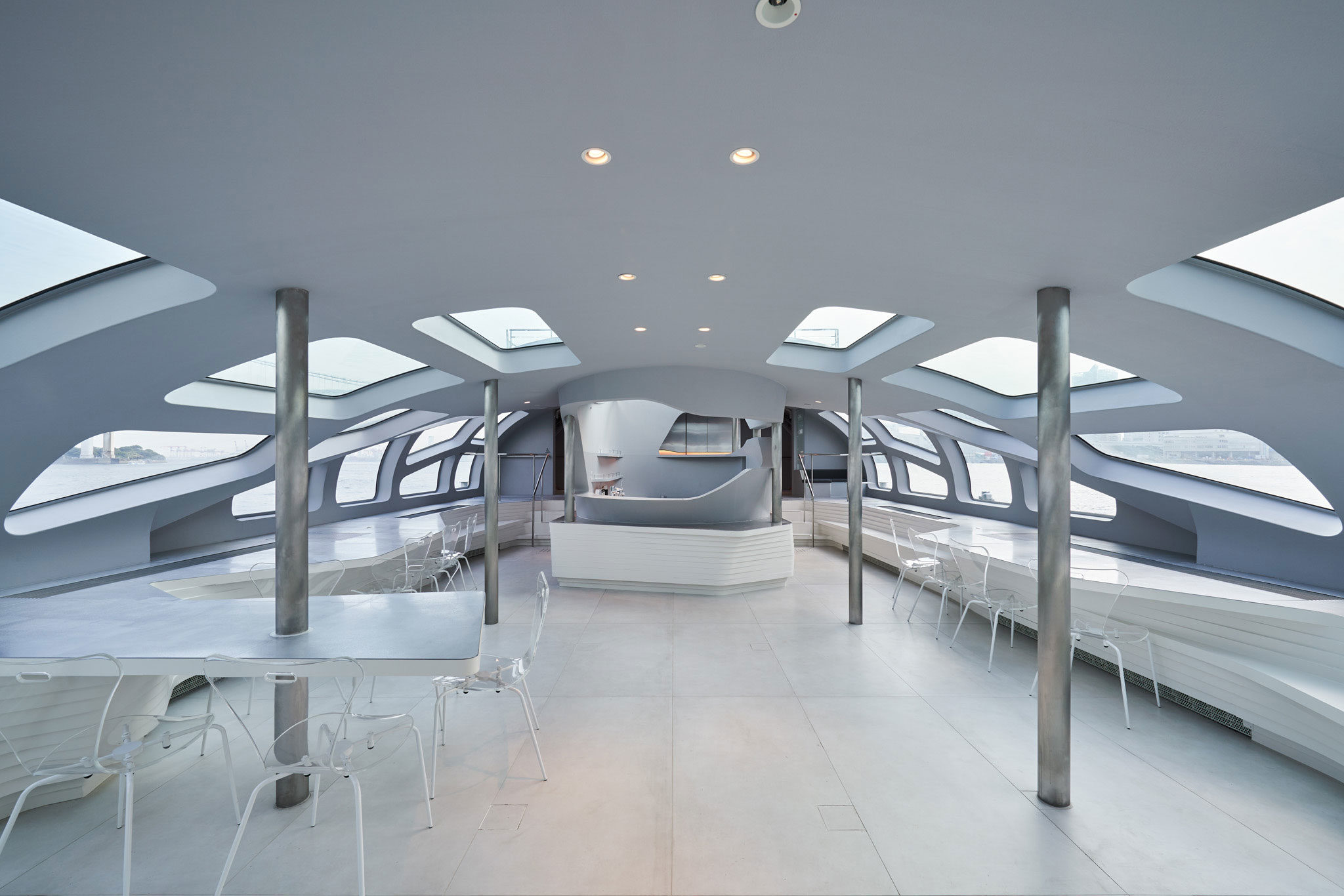ザハ・ハディド事務所による、双胴船「オナイリック」。イタリアの造船会社ロッシナビの旗艦船。波の流動性とダイナミズムを元に外装や内装をデザインし、船と海の境界が曖昧になるよう意図。3層の太陽光パネルで環境に配慮した航行が可能architecturephoto.net。