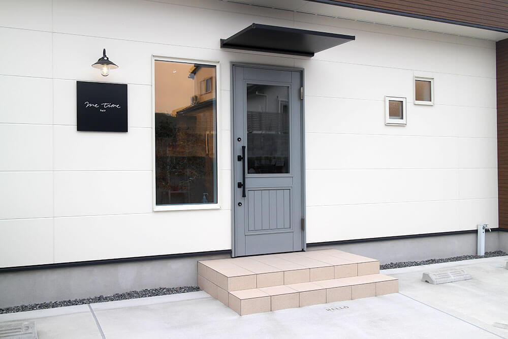 モノトーンの外観がおしゃれな1席限定美容室 me time hair と木製玄関ドア。 - ユダ木工株式会社。