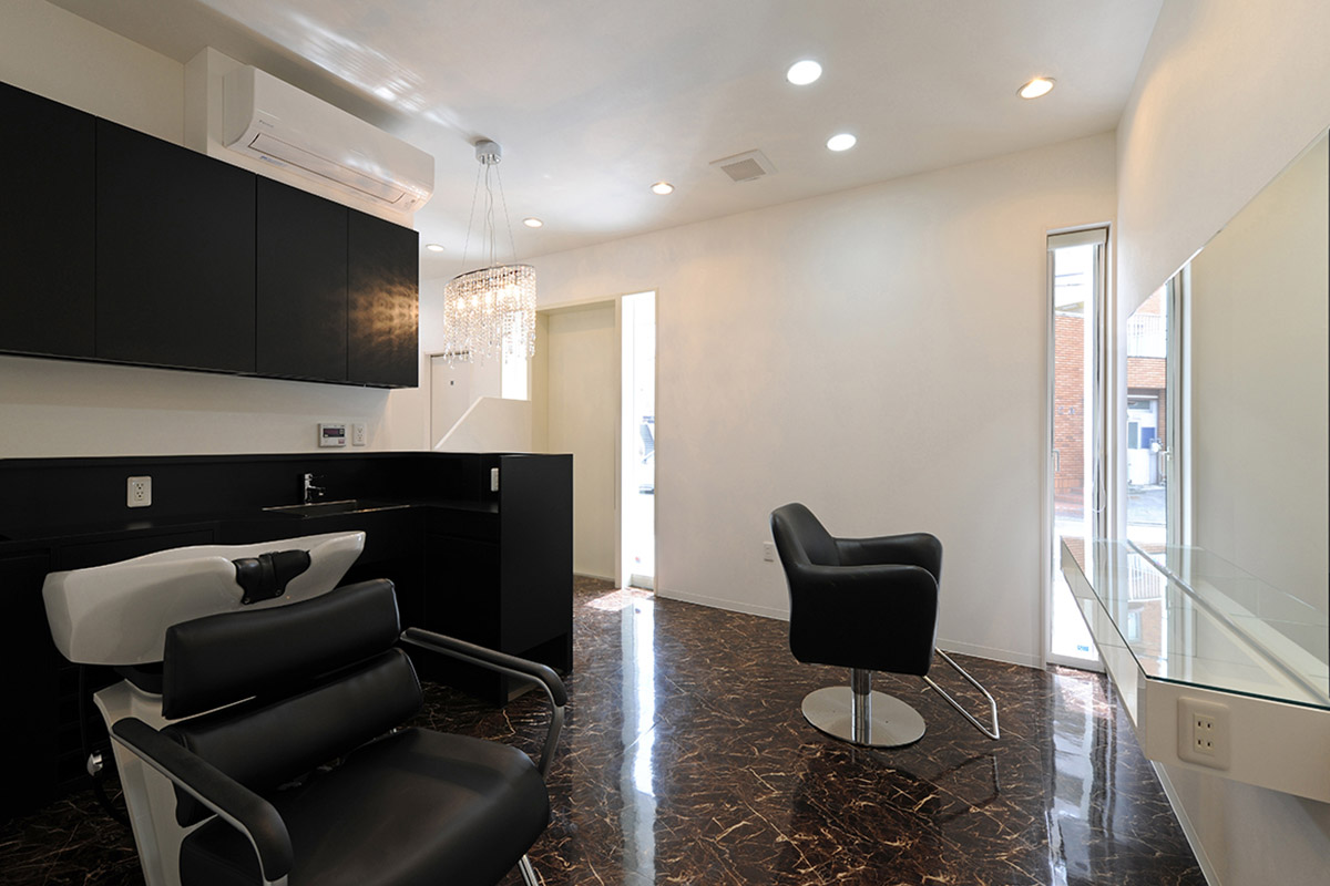 美容院。モノトーンの中で、床材を工夫して高級感のある印象です。 - 事例写真「美容院 を併用したスタイリッシュなガレージハウス」注文住宅のハウスネットギャラリ。