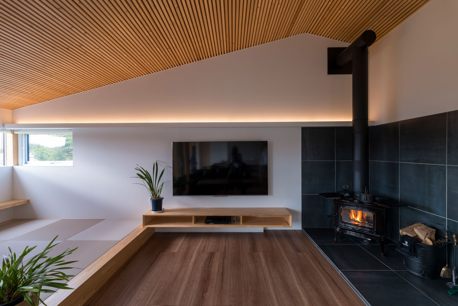 計算し尽くしたテレビ配置. 勾配天井に間接照明を仕込み、印象的なテレビコーナーを創出しました。壁面にピッタリ納まるテレビボードの背景は、シックなグレーのアクセントウォール。事前に壁掛けテレビの配置を決め、配線が見えないように計算することで、スッキリ。