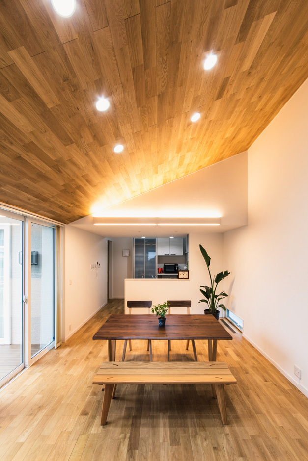 間接照明に照らされて、勾配天井の木目がゆたかな表情をもたらすダイニング。掃出窓を天井いっぱいの高さまで設けたことで、無駄なラインのない洗練さ。