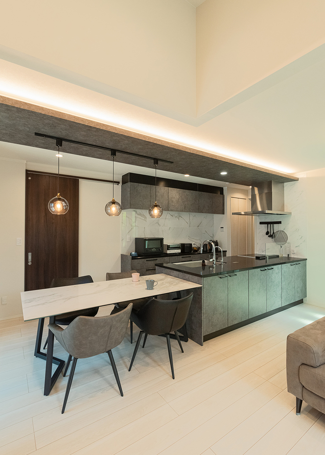 下がり天井を間接照明が彩るキッチン。前面・背面ともに収納がたっぷり。後ろのドアは水回りへとつながる くふうイエタテ。