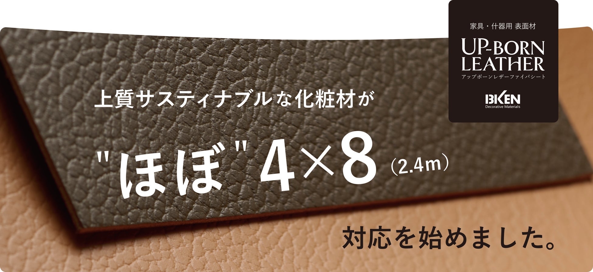 UP_BORN LEATHER 上質サスティナブルな化粧材が、2.4m ほぼ4×8サイズ 常備対応を始めました。イビケン株式会社のプレスリリース。