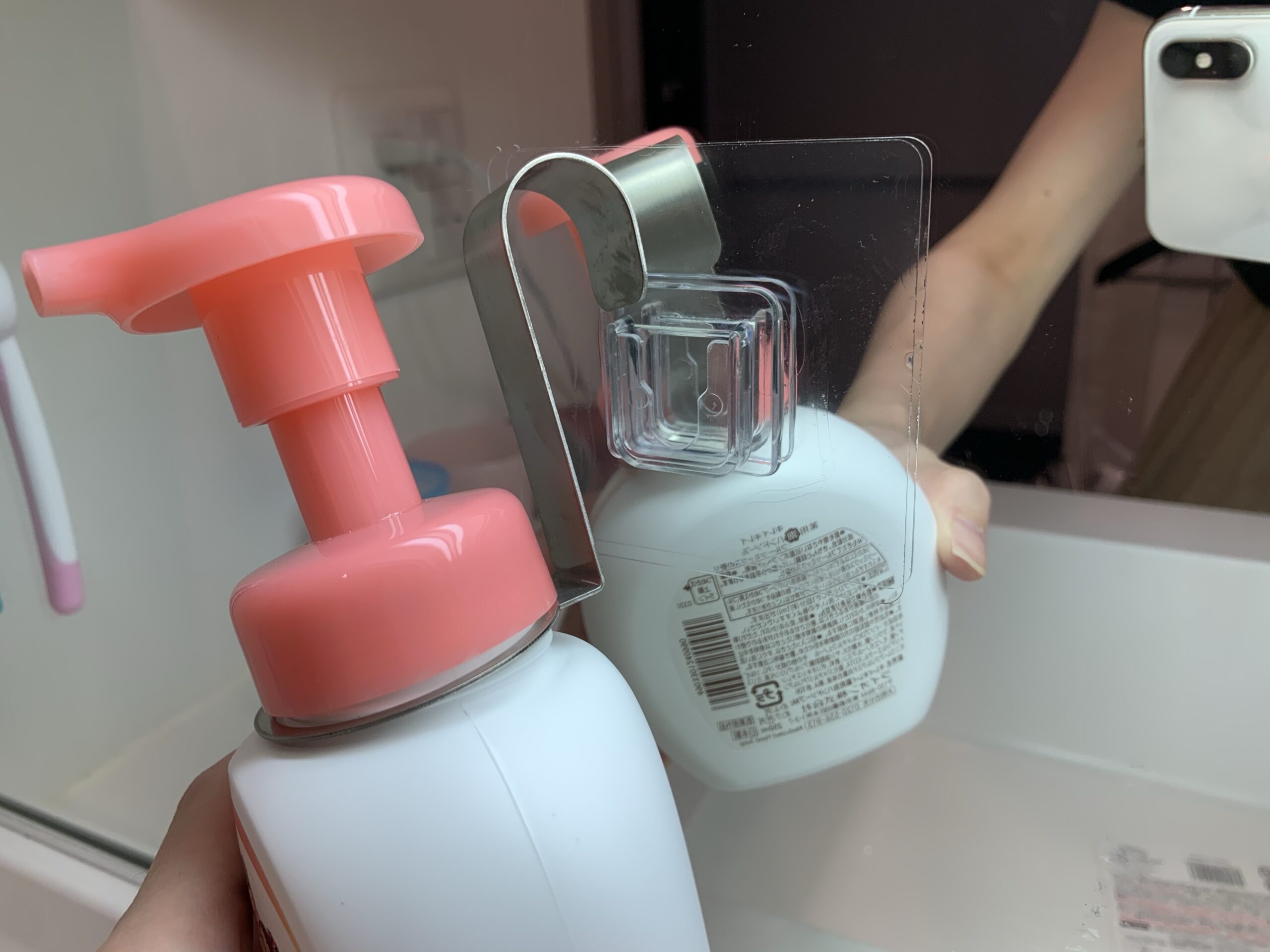 浮かせる収納 鏡に両面テープだと落ちるディスペンサー対策-100均。