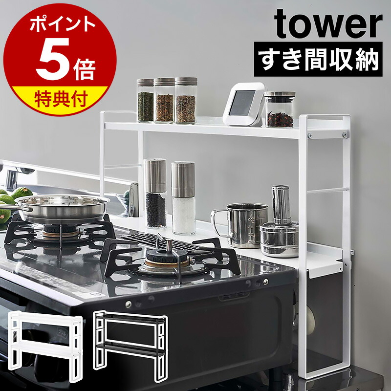選べる特典付きコンロ奥隙間ラック タワー 2段山崎実業 tower キッチン収納 ガスコンロ ラック コンロ奥ラック 隙間ラック 台所ラック棚 キッチン ラック 隙間収納 コンロ周り コンロ奥 調味料ラック スリム キッチン 油はね 汚れ防止 ブラック ホワイト 5221 5222。