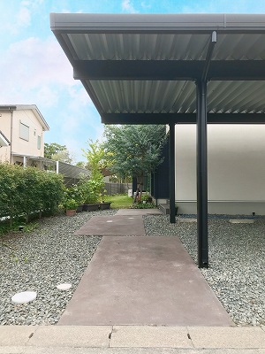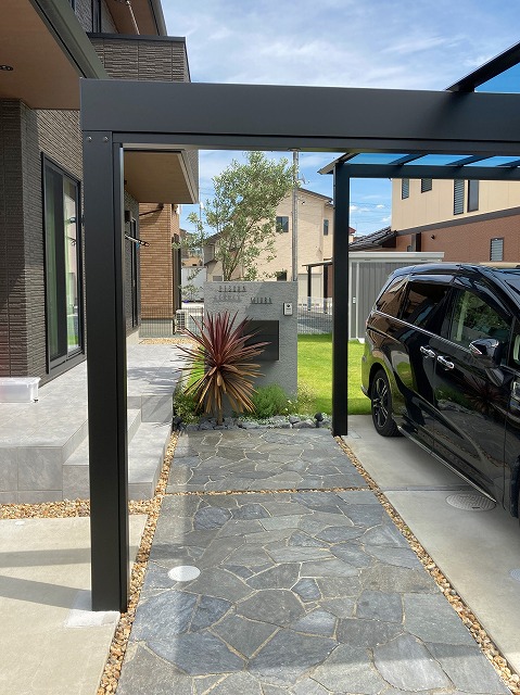 間口延長カーポートで玄関アプローチを快適に福井県カーポート・エクステリア福井ミニハウス。