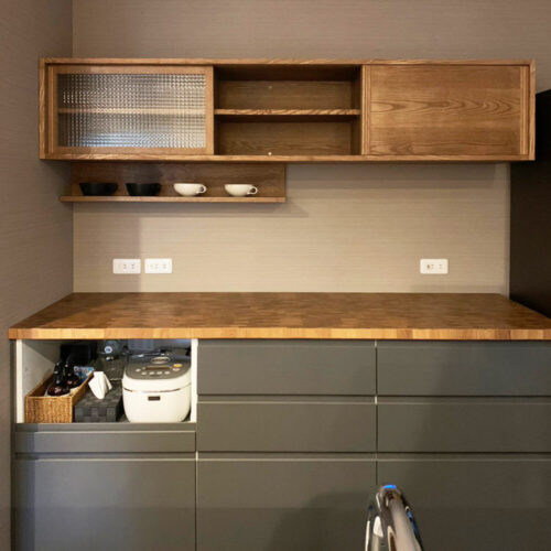 吊戸棚とカップボード食器収納 ナラ無垢材天板 5127 - オーダーメイド家具キッチン家具工房ツリーベ。