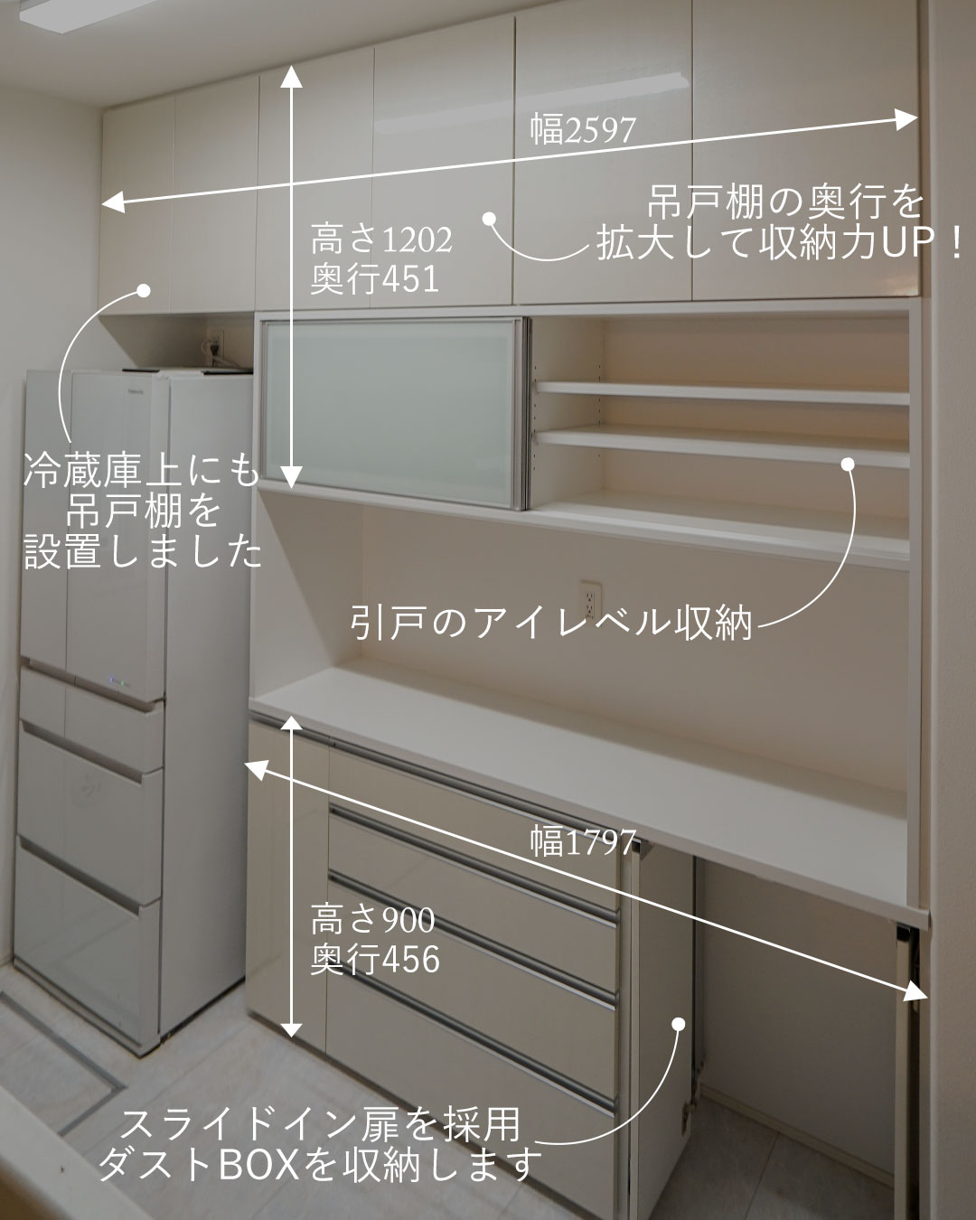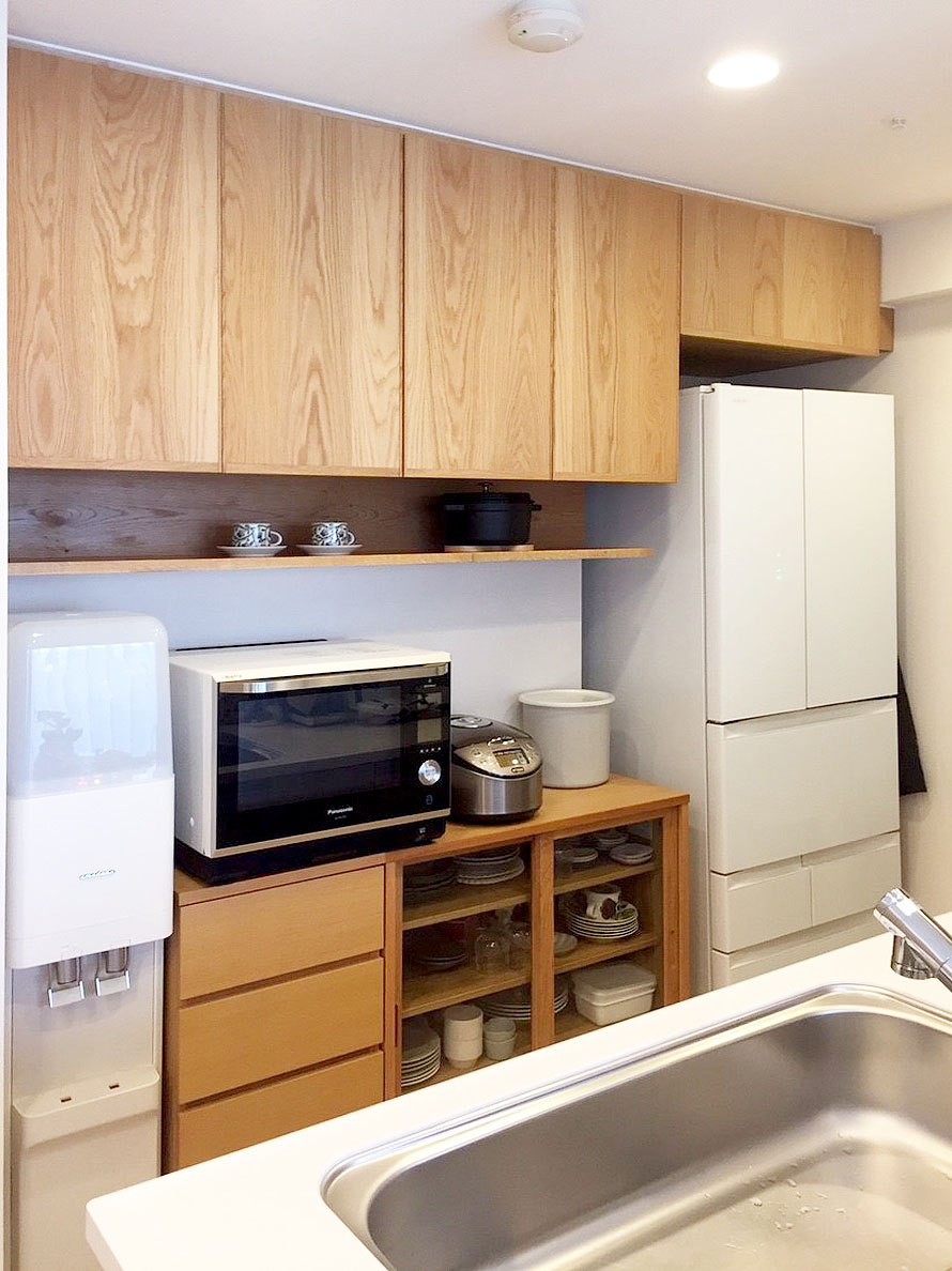 吊り戸棚奥行き77ミリ増、下台は474ミリ、まさにミリ単位調整!-東京都の施工事例 オーダー食器棚プレミアム │オーダー家具専門店GNASH ナッシュ。