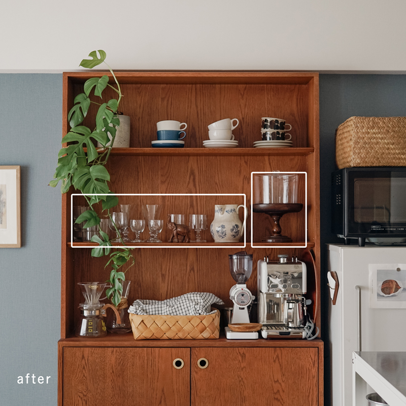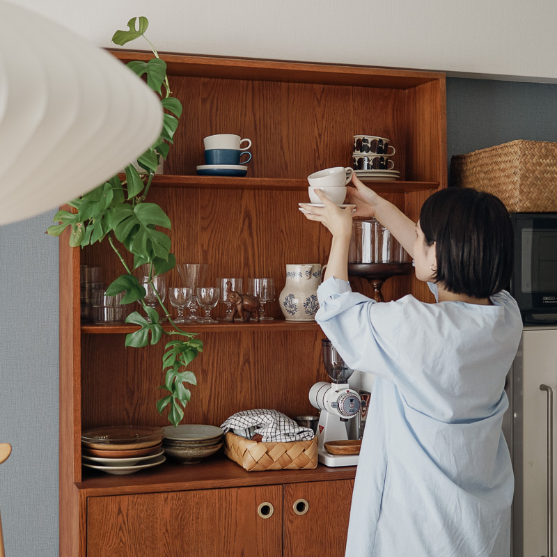 インテリアと家事動線を美しく。「見せ置きできる食器棚」楢材キッチンシェルフL 後編アンジェ日々のコラム。