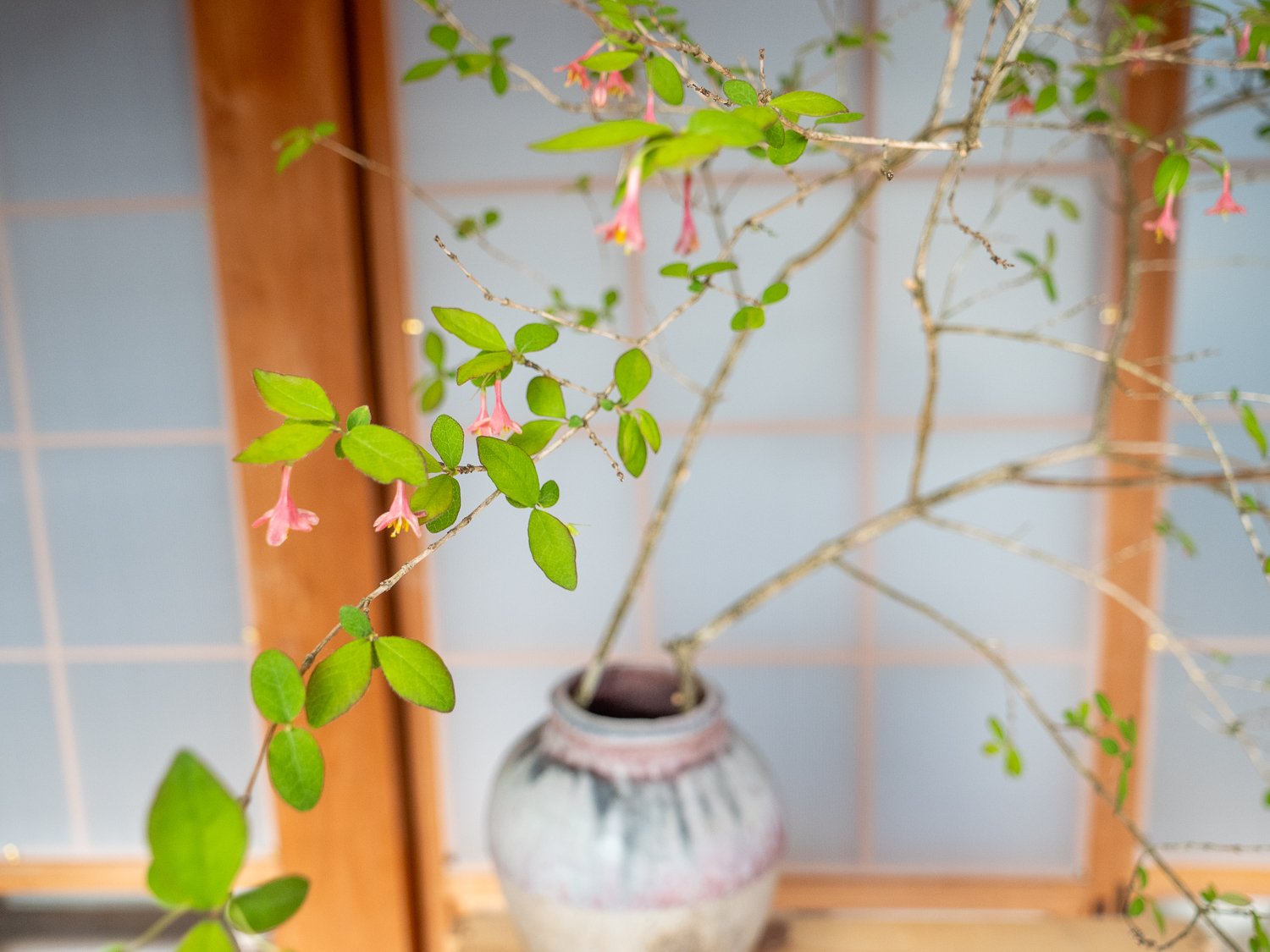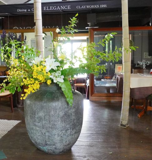レストランの大きな壺にお花をいける いろいろなテーブルにも小品をいけばなライフ・Mirinegi。