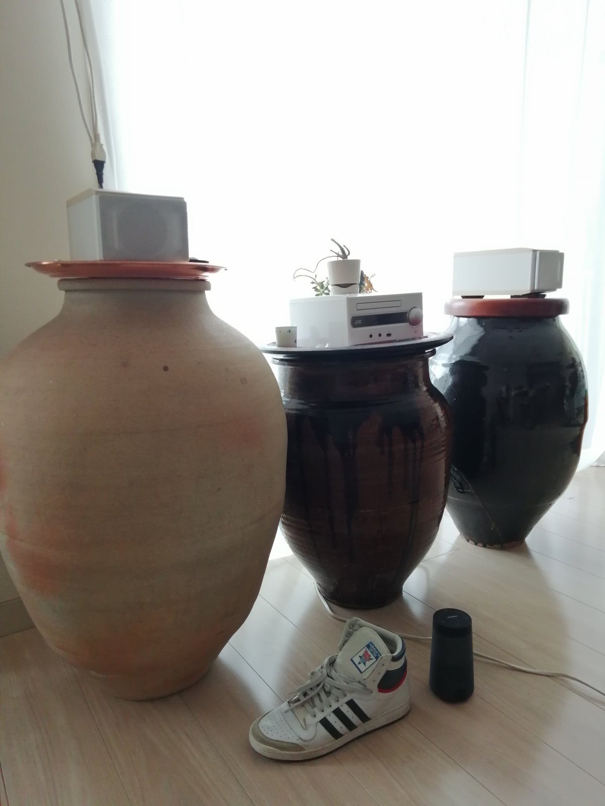 買ったは良いが置き場と使い道に困っていた壺がステレオ置き場になった。1番大きいのが高さ約80センチ。でかい です。左の2つはヤフオクで購入し、大きくて発送不可だったので、宮城の松島まで取りに行ったモノ。絵kazunarishKAMEKAME。