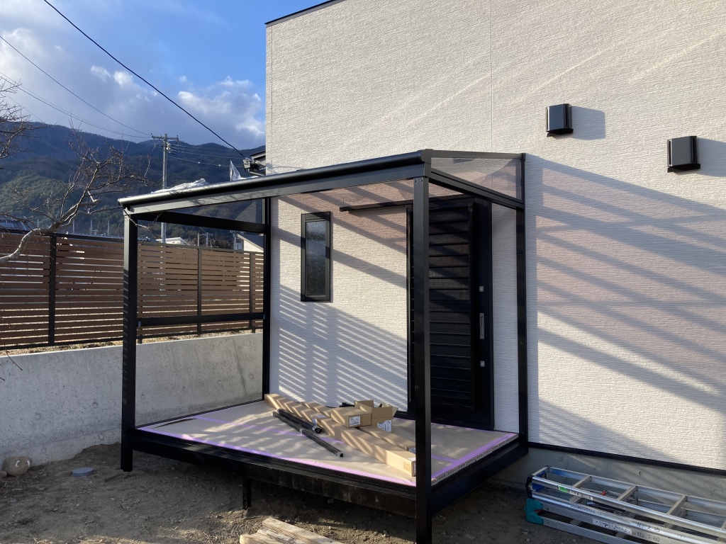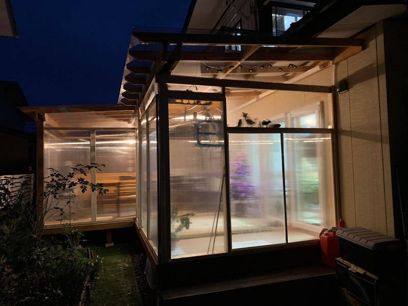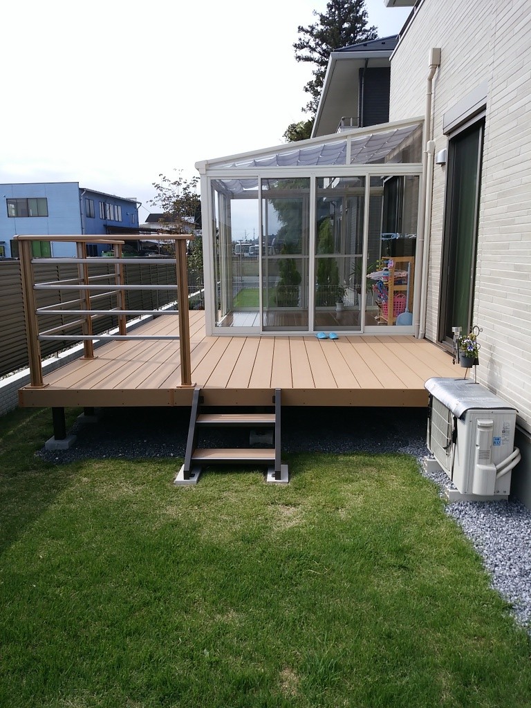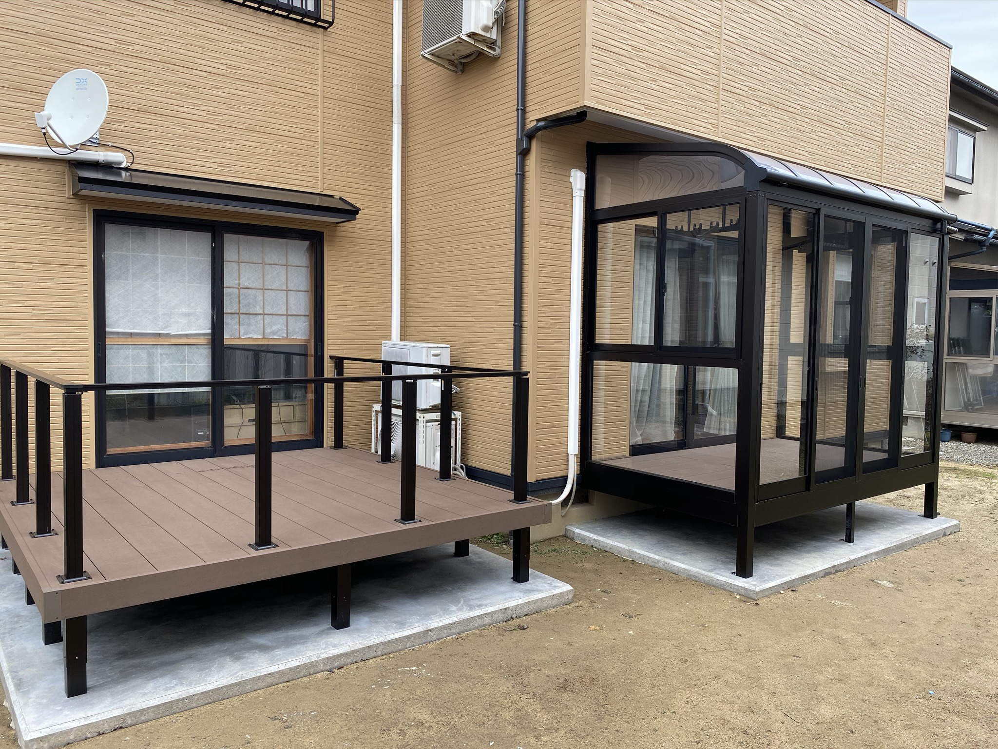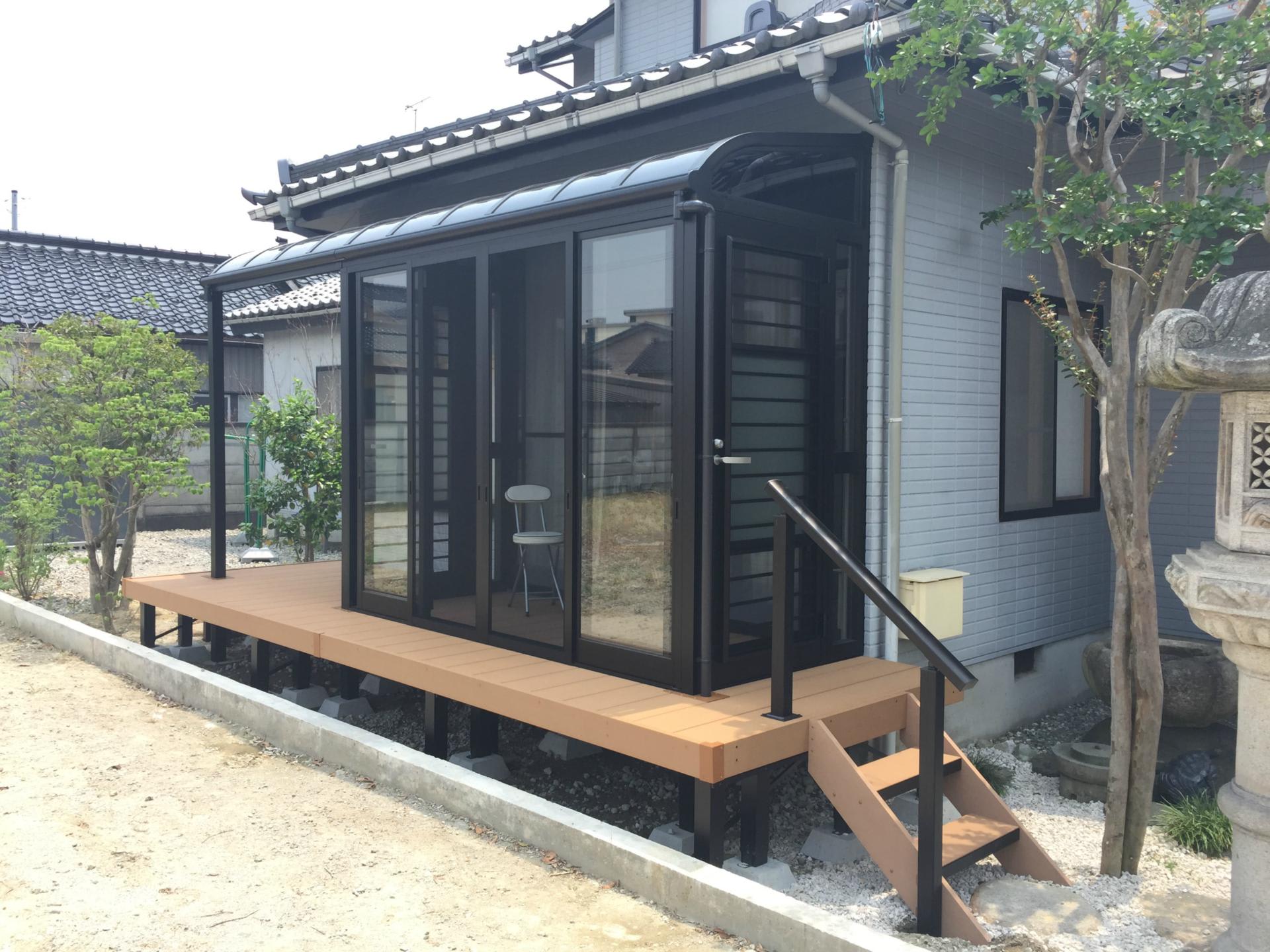 ウッドデッキとサンルームを組み合わせたお庭 D様福井県カーポート・エクステリア福井ミニハウス。