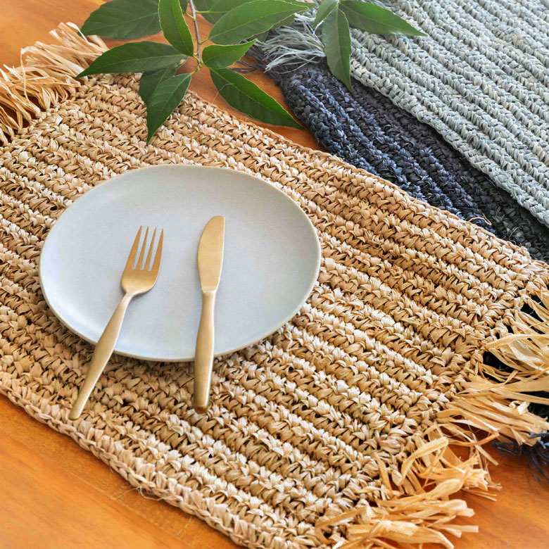 ランチョンマット 天然素材 ラフィア フリンジ付き 46cm × 34cm ランチマット おしゃれ 椰子 素材 麦わら かわいい インテリア 長方形フリンジ ナチュラル リゾートインテリア ナチュラル ライトブルー ライトブルー 西海岸 ハワイアン サーフ コースタル1388。