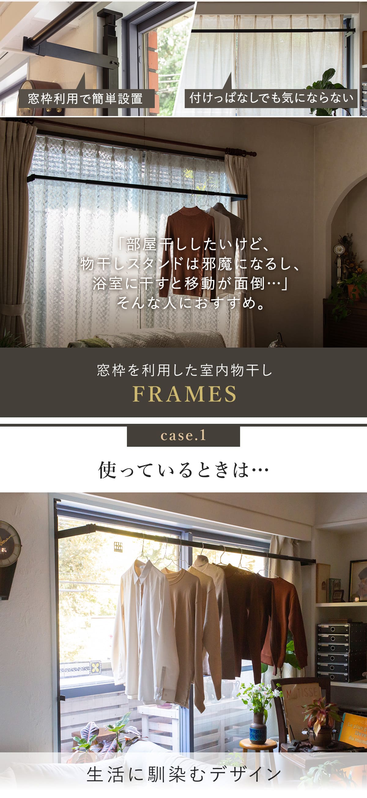 物干し 室内 FRAMES 窓枠突っ張り物干し室内物干し 突っ張り 窓枠 折りたたみ 伸縮 日本製 物干し竿 ランドリー 洗濯 室内干し工事不要 おしゃれ。