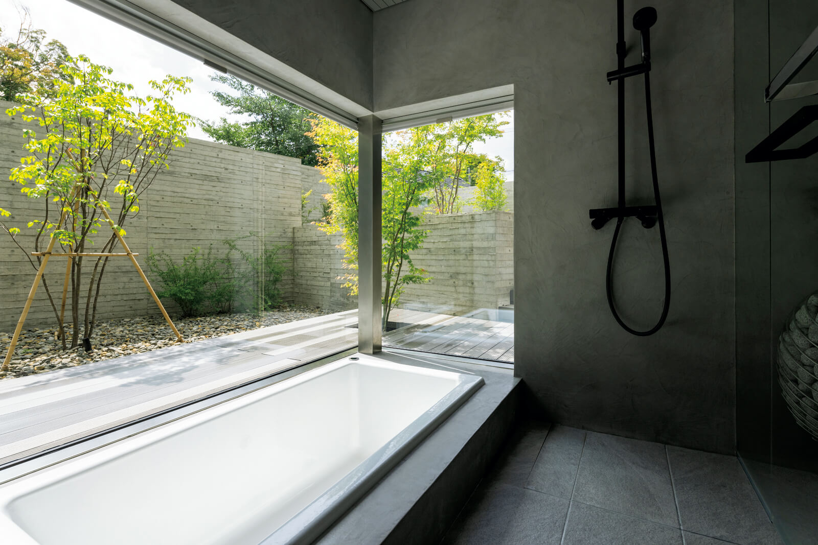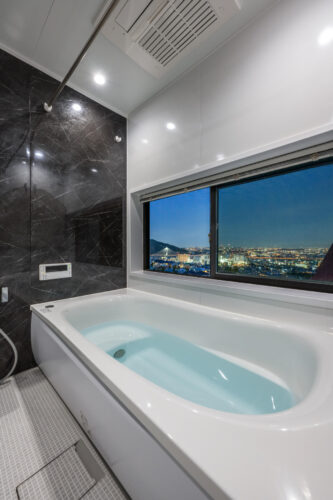 落ち着いた黒のアクセントパネルが高級感を演出する浴室 - 事例写真「ペントハウスのある家」注文住宅のハウスネットギャラリ。