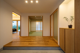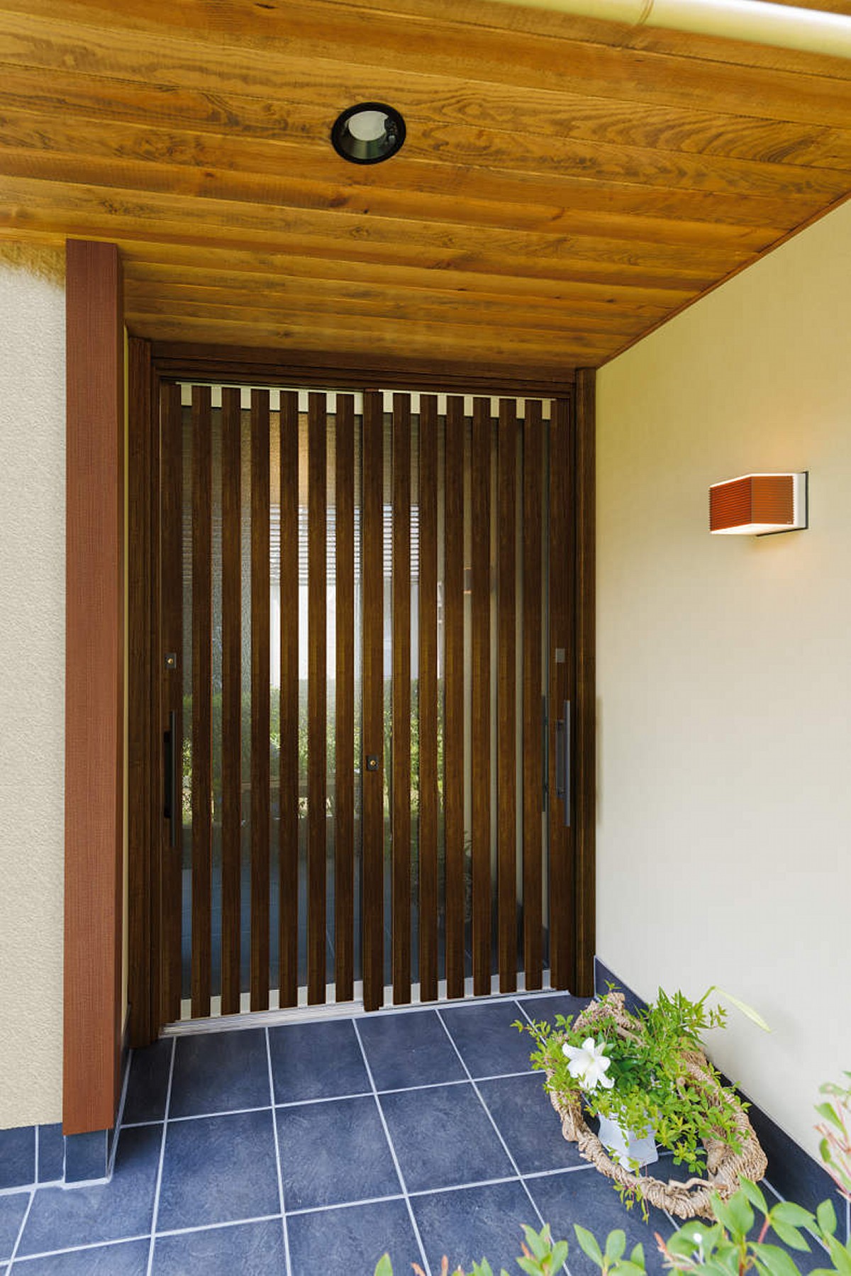 和風のデザインが際立つ美しい木製引き戸と明るい光が差し込む玄関ポーチ - 事例写真「時間がゆっくり流れるナチュラル&モダン な住まい」注文住宅のハウスネットギャラリ。