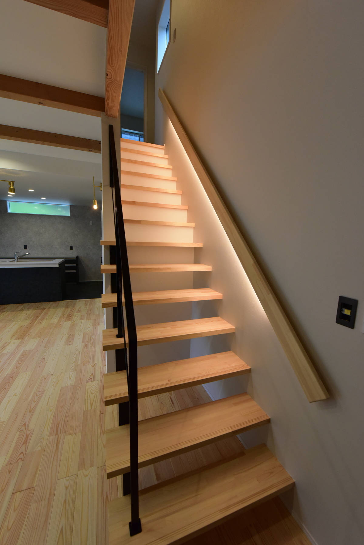 壁に埋め込まれた手すり照明が、シンプルながらも洗練されたデザインを引き立てる階段 -事例写真「実用性とデザインのバランスが秀逸な二世帯住宅」注文住宅のハウスネットギャラリ。