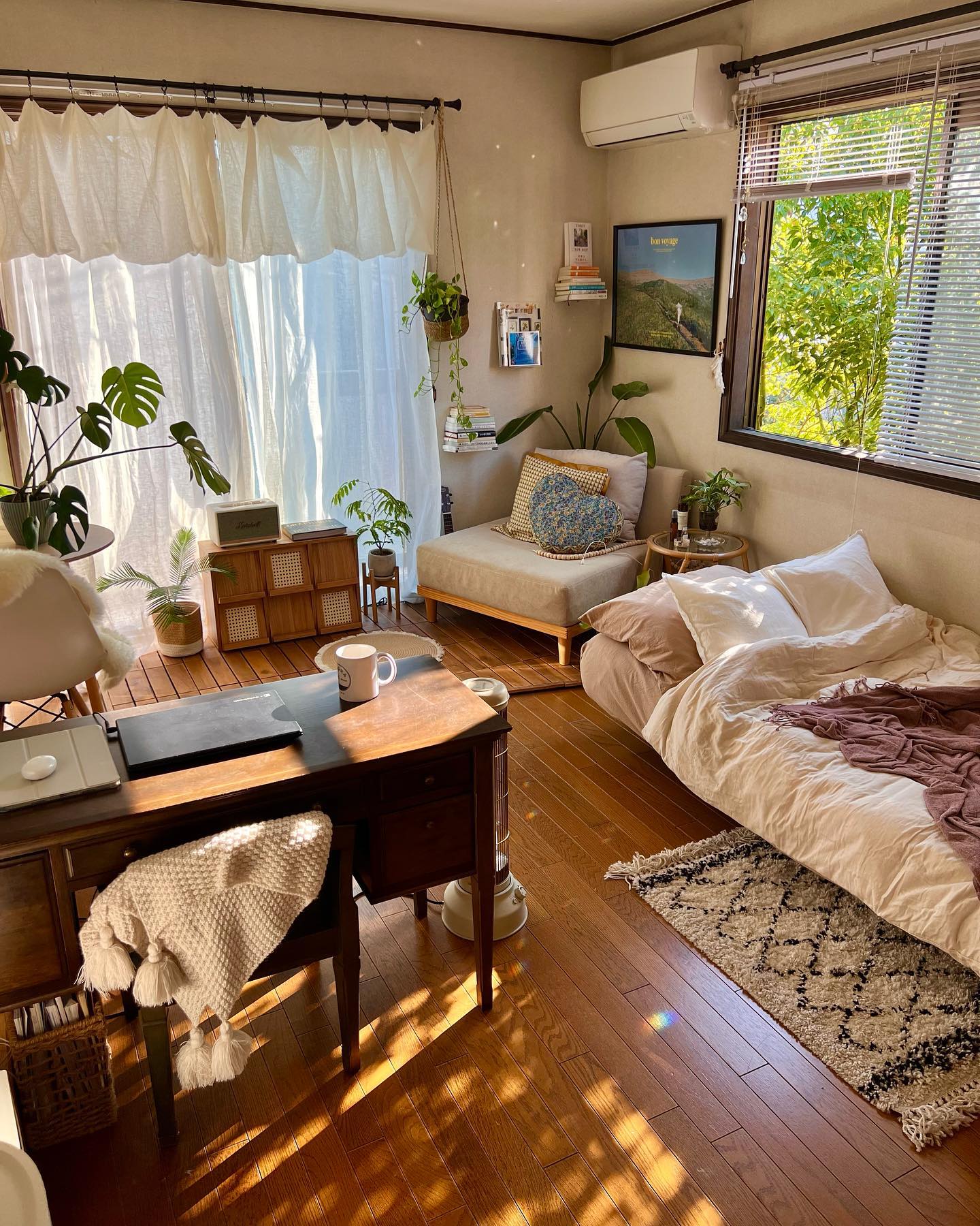 ボヘミアンインテリア 暖色の灯りと植物に包まれた1K一人暮らしのお部屋紹介。