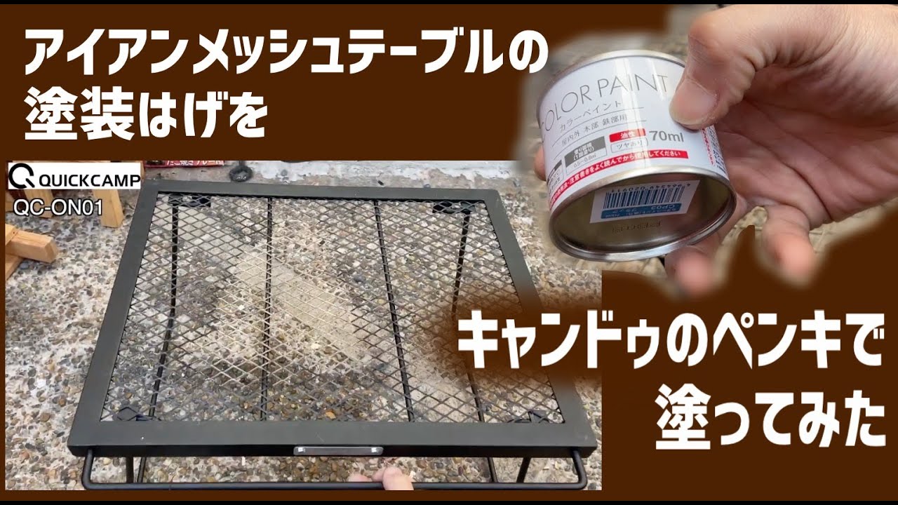 キャンドゥのペンキでクイックキャンプアイアンメッシュテーブルのハゲた天板を塗るcandoquickcamp天板塗装。