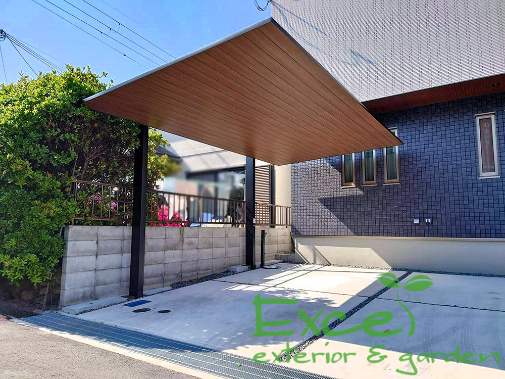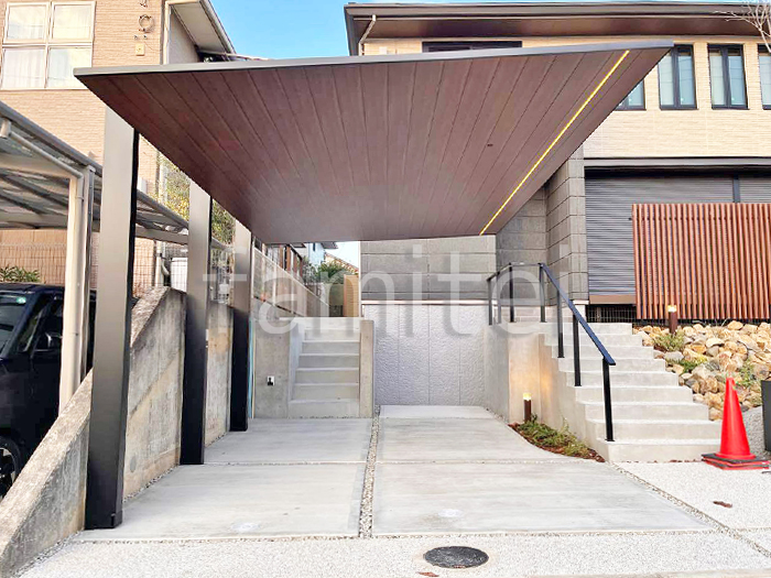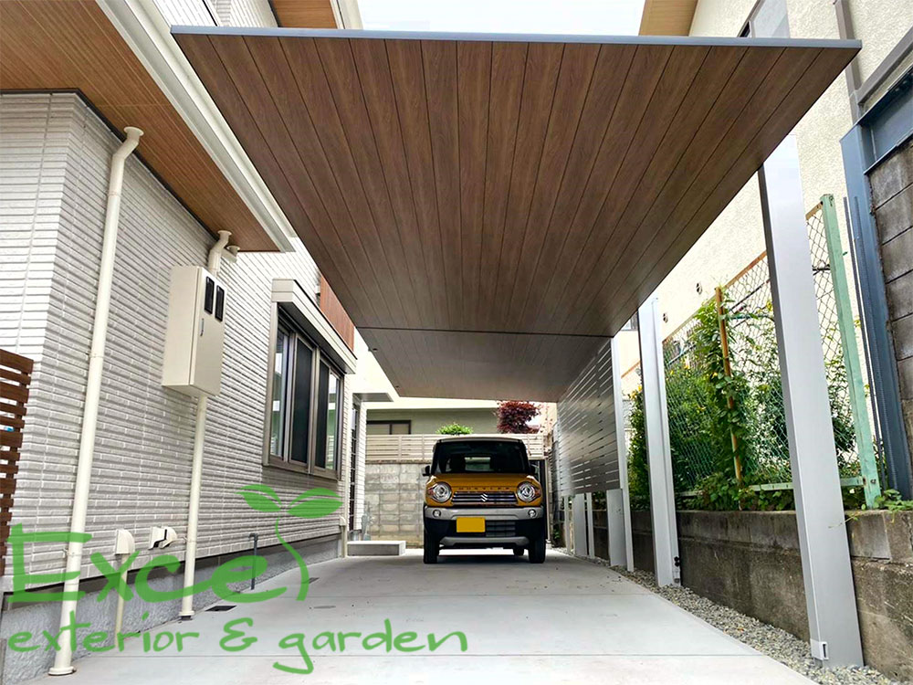 カーポートSC木調色住宅に調和するデザインLIXIL尼崎市大阪・神戸外構・エクステリアエクセル。