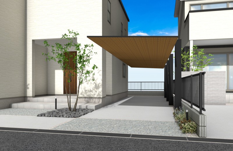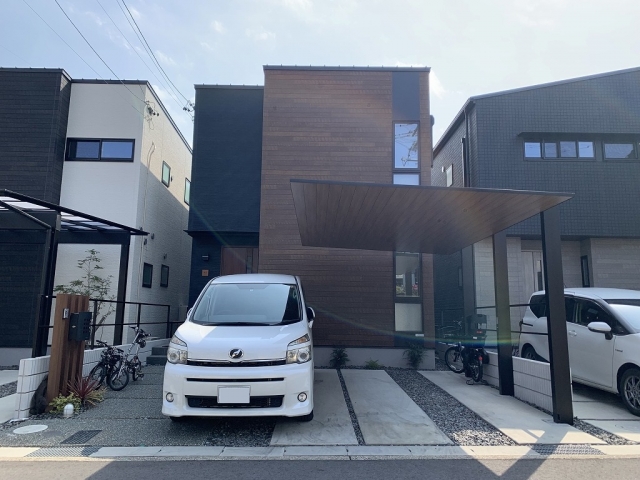 カーポートSCで魅せる ウッド調を取り入れた大人のナチュラルモダン外構 鈴鹿市・新築外構–お庭&エクステリアのCercle セルクル 鈴鹿市・四日市市。