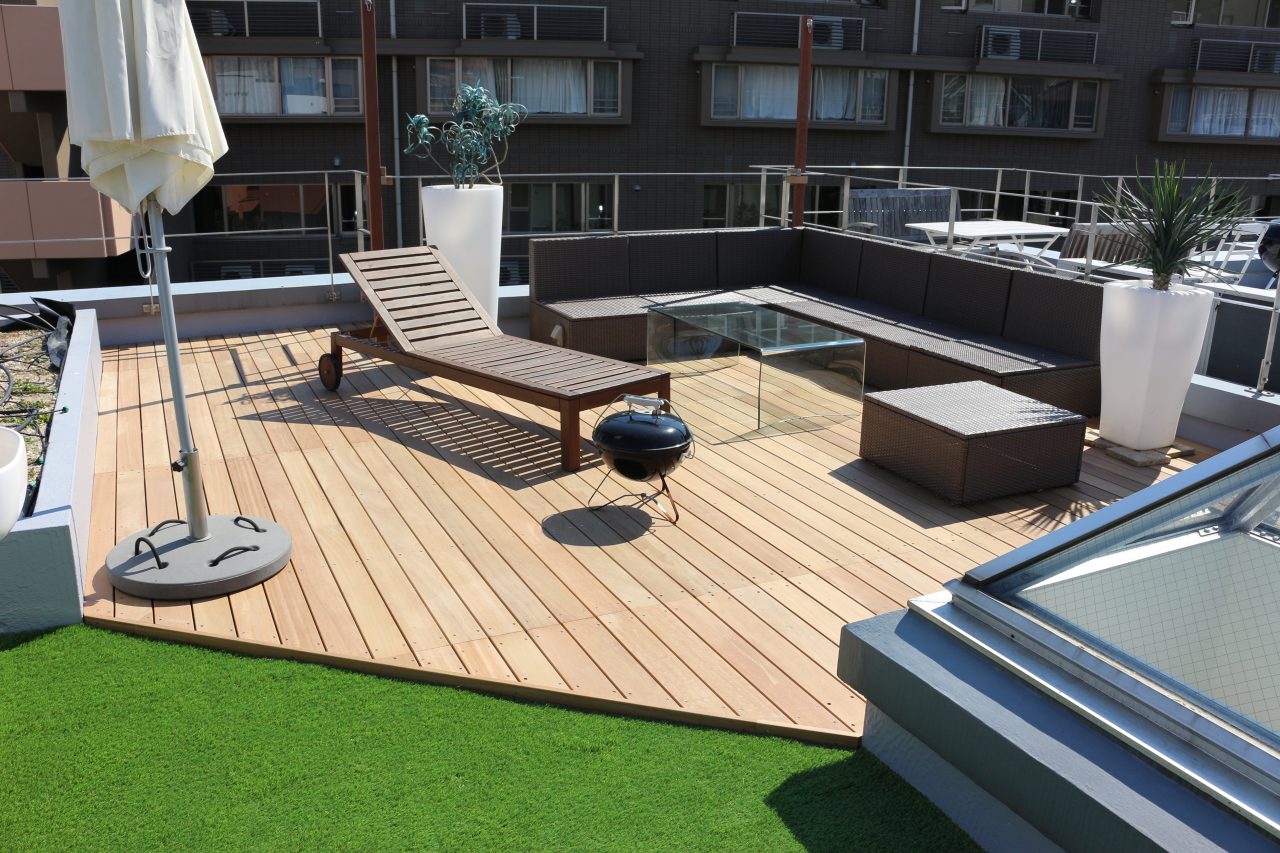 コーポラティブハウス屋上 人工芝とウッドデッキのコントラストが美しいワンランク上の大人空間 渋谷区 マンションルーフバルコニー ウッドデッキ-ガーデンハーツ株式会社横浜のウッドデッキ専門施工会社。