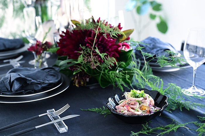 お花と黒い食器で洗練されたテーブルセッティングに。