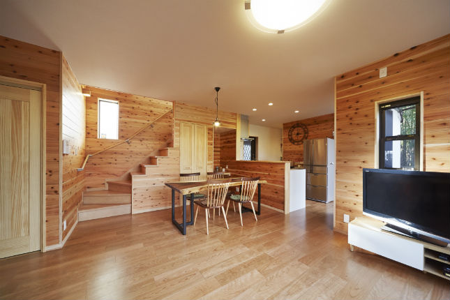 壁に無垢の杉板を施したログハウス風のLDK 箕面市 施工事例:リビングダイニングリフォーム 箕面市のリフォームはナサホーム。