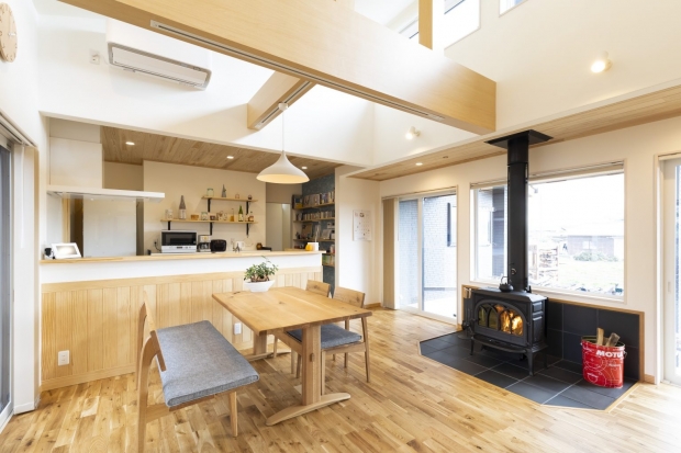 薪ストーブとログハウス風の内装が落ち着く居心地のよい平屋-キノエデザイン ㈱秋山住研。