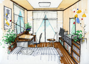 インテリアコーディネーターインテリアパースインテリアコーディネートパース講座スケッチ講座jw_cad空間デザイン間取り図カラースキームイメージパース北欧北欧ナチュラルアロマアート散歩公園フィーカヒュッゲ イラストマップ。