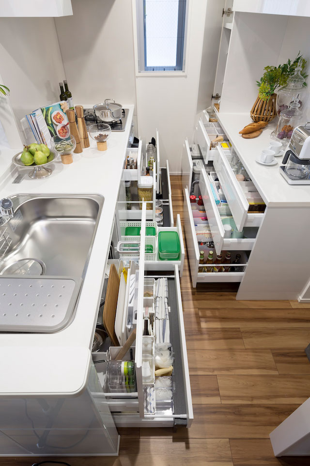 キッチンが狭い! レイアウトの問題? 収納術で解決するスッキリ見せアイデア21Flowers。