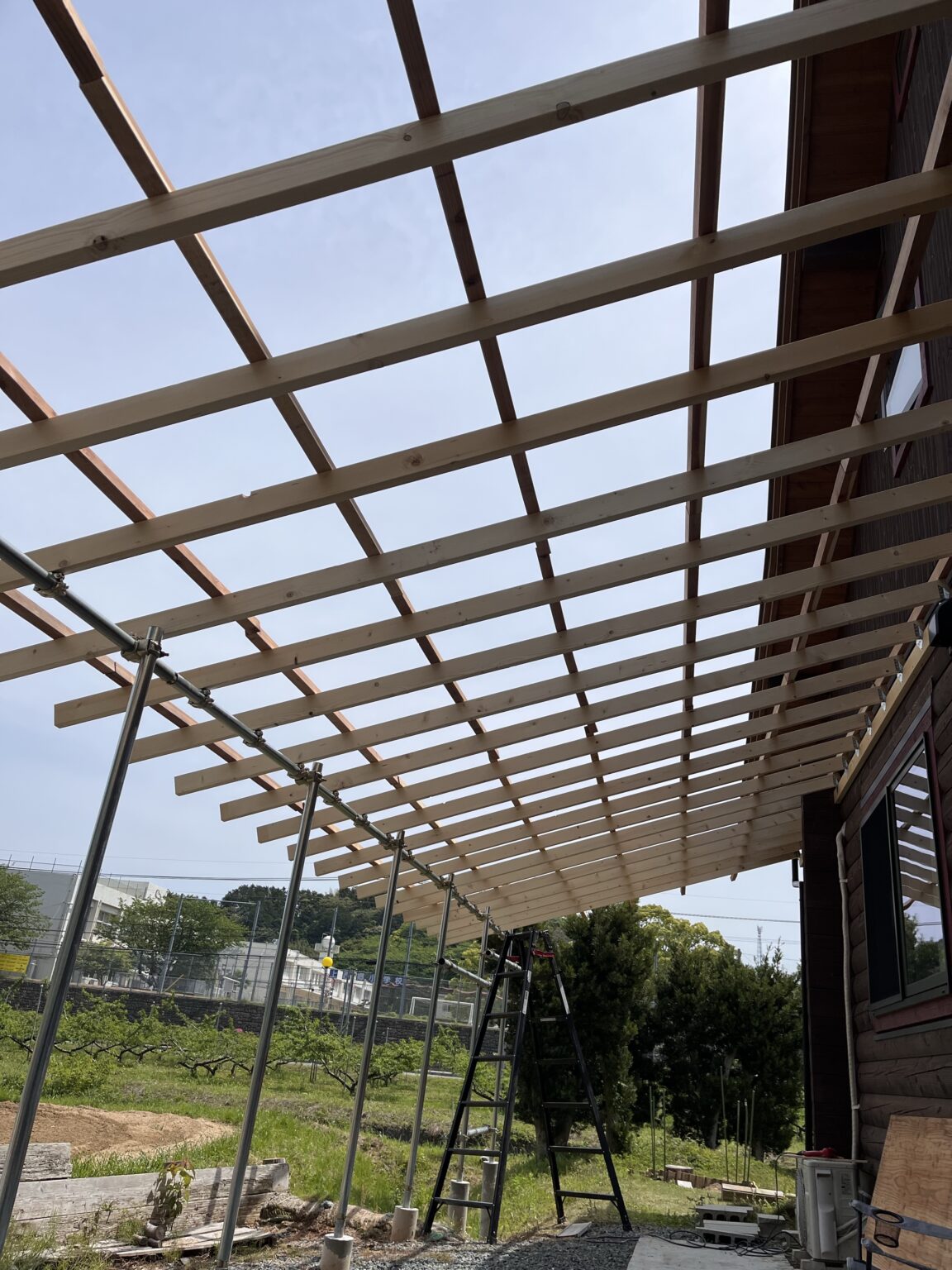 外構DIY BESSの家 雨漏り対策の下屋 パーゴラ屋根 を作っていく話 vol2 単管パイプ柱&垂木編。