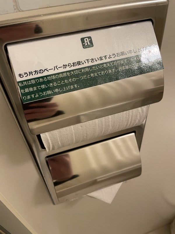 東京のホテルで見つけた「小さなエコ活動」 ・上のぺーパーからどうぞお使いください。 ・私たちは限りある地球資源を大切にしたいと願っています。 “ トイレットペーパーを最後まで使い切るのもひとつ” まずできることから始めましょう❗️ 日高昭彦。