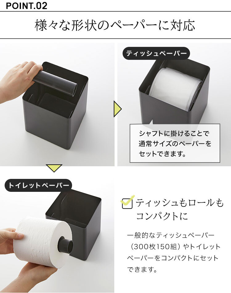 山崎実業 上から出せるティッシュ&トイレットペーパーケース リン RIN ティッシュケース 縦置き ロールティッシュ ケース キューブ ボックスハーフ おしゃれ ホテル シンプル 白 黒 モノトーン スタイリッシュ スチール 高級感 2001 2002 北欧 コンパクト 省スペース。