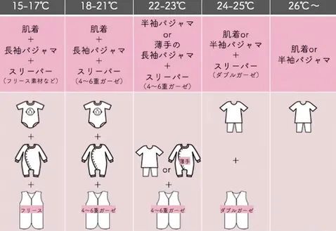 赤ちゃんの寝る時の服装「室温別パジャマの見本」 -温度調節のコツは?マイナビニュース。